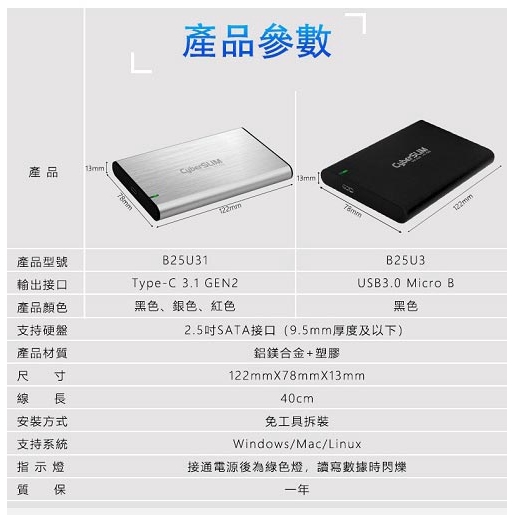 CyberSlim B25U31 2.5" USB 3.1 Type-C 對 USB-A 硬碟外接盒 /紐頓e世界