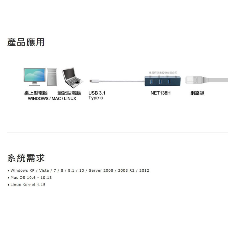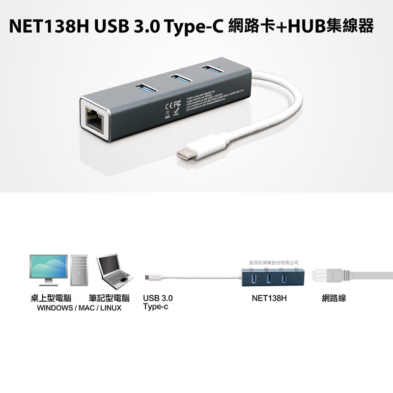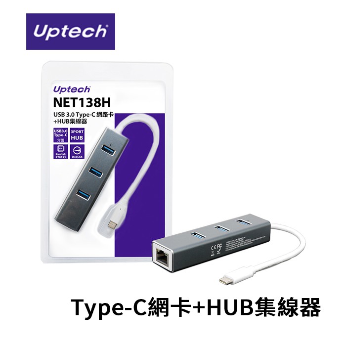 Uptech 登昌恆 NET138H USB 3.0 Type-C 有線網卡+HUB集線器 /紐頓e世界
