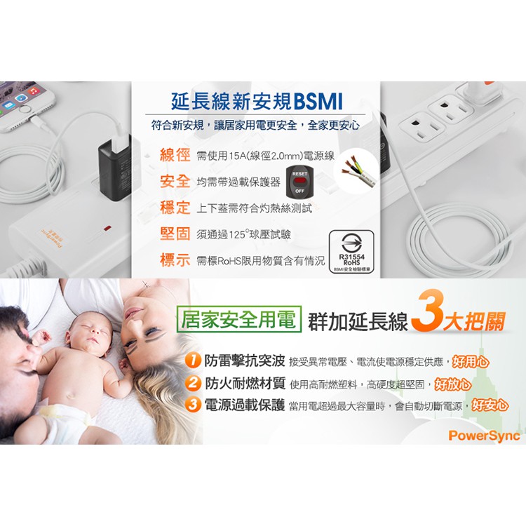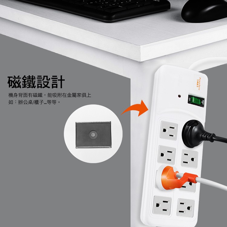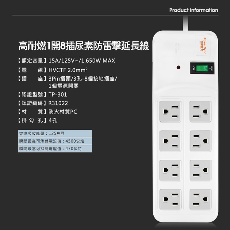 PowerSync 群加 TPS318TN9018 1開8插 高耐燃尿素防雷擊延長線 白1.8M 6呎 /紐頓e世界