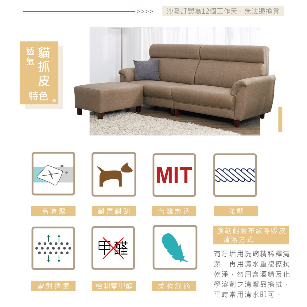 安格斯大L型透氣貓抓皮沙發+莉塔4尺緩衝升降茶几