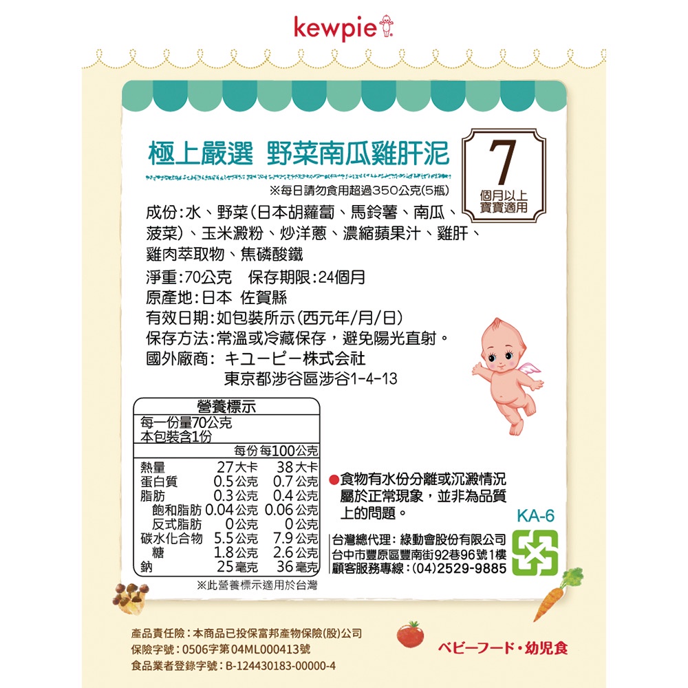 寶寶副食品 寶寶粥 日本Kewpie KA-6極上嚴選 野菜南瓜雞肝泥7m+70g kewpie官方直營店