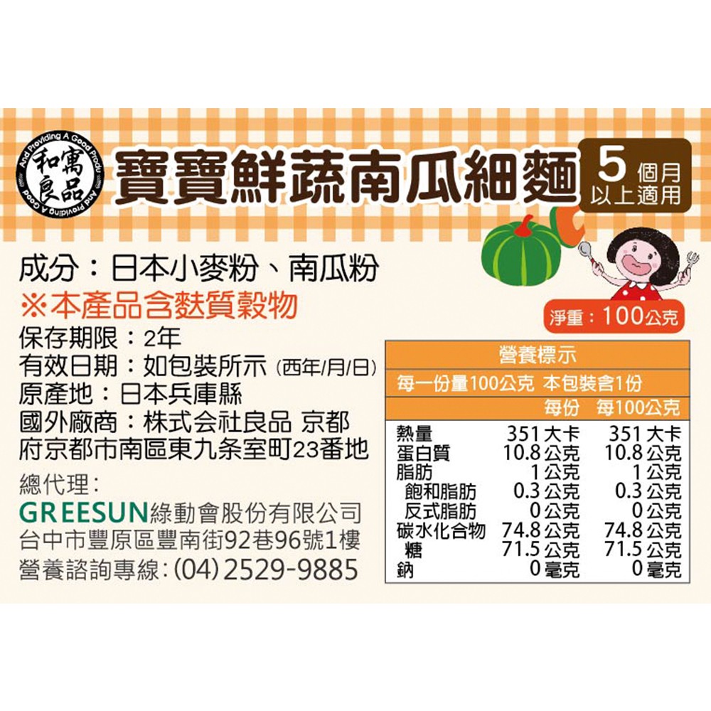日本和寓良品 寶寶鮮蔬南瓜細麵100g kewpie官方直營店