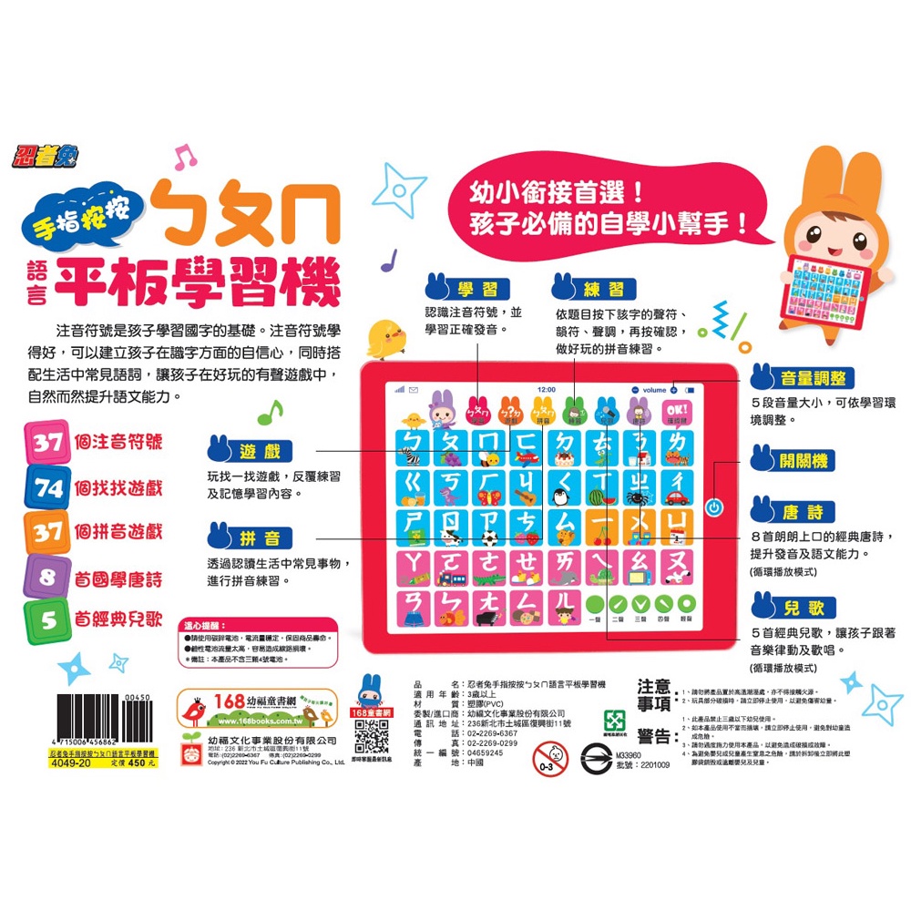【幼福】忍者兔手指按按語言平板學習機-168幼福童書