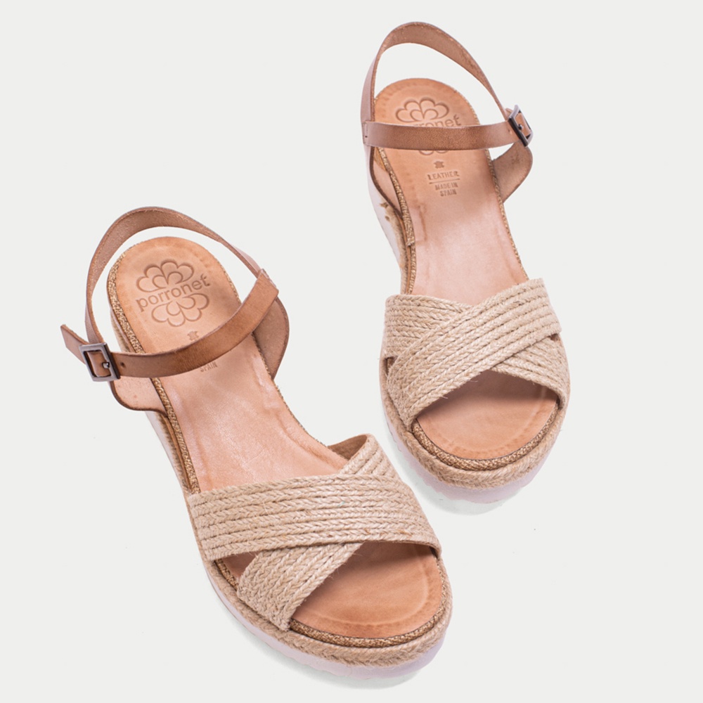PORRONET 草編交叉繞帶楔型涼鞋-奶茶棕