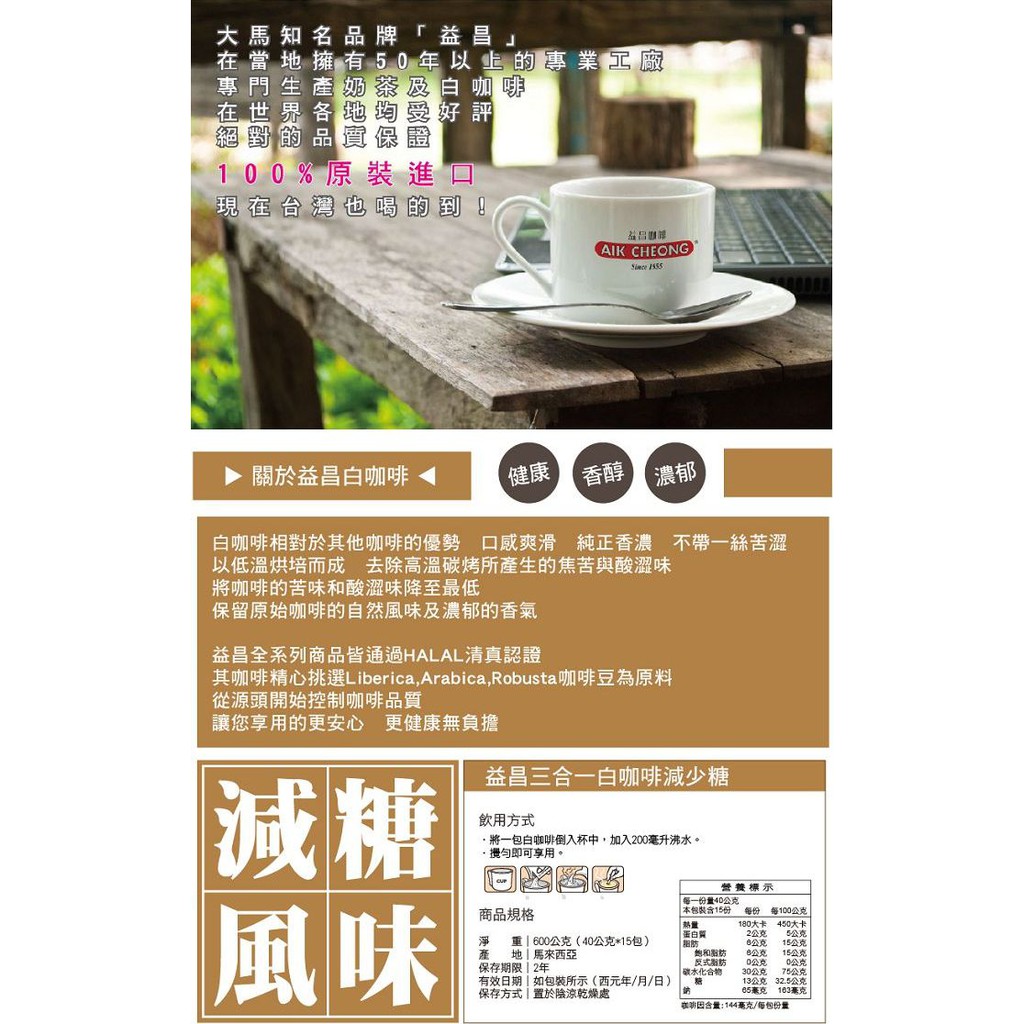 【益昌】益昌經典三合一白咖啡-減少糖 X3袋+益昌南洋風味香滑奶茶 X2 袋