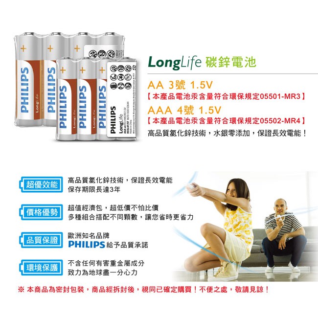 PHILIPS飛利浦 LongLife R03L4F/97 碳鋅電池4號4入