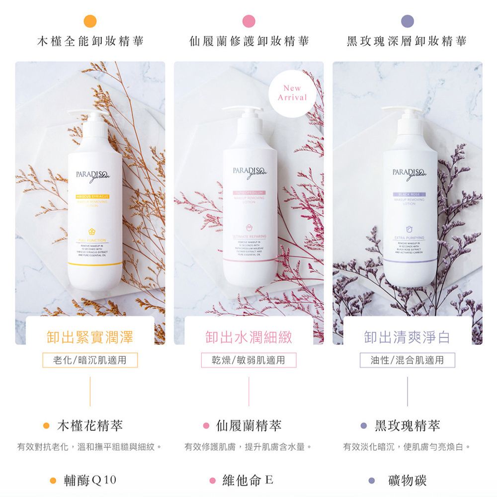 天堂花園 熱銷花植萃卸妝精華500ml(黑玫瑰淨白/仙履蘭保濕/木槿抗老)