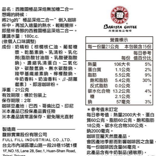 西雅圖極品深焙無加糖二合一咖啡 21g(袋裝)(新效期)濃 醇 香