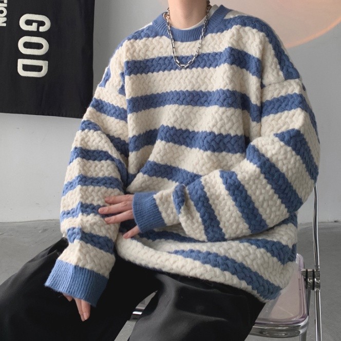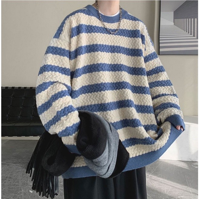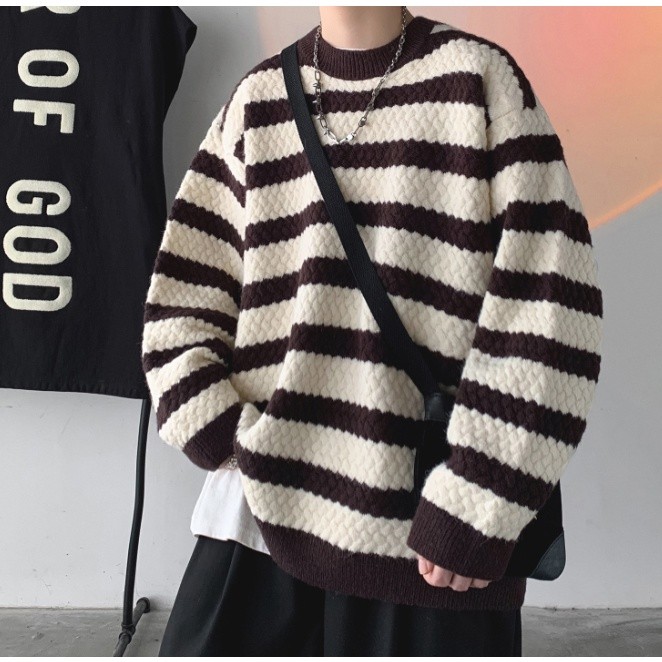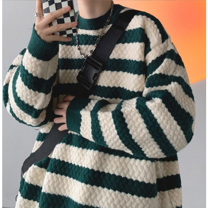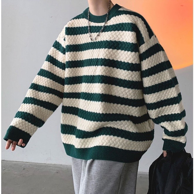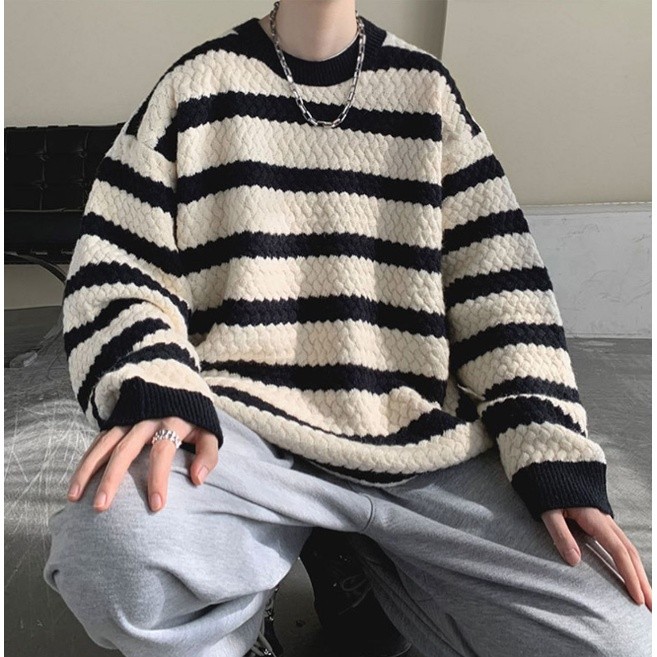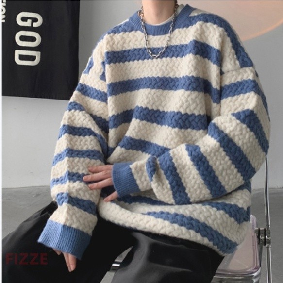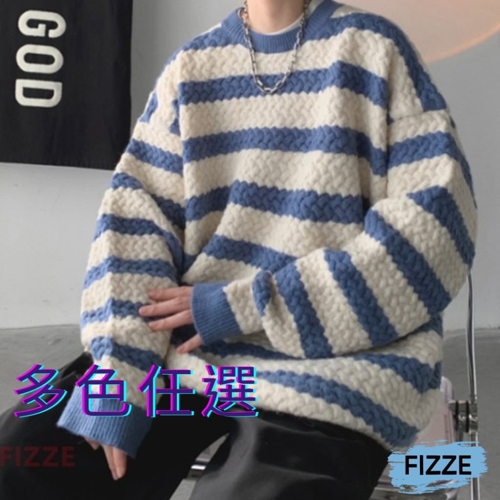 秋裝上衣 情侶款 男女同款 條紋毛線衣 秋冬季新款毛衣 男士寬鬆 韓版 打底針織衫(BWJ724【FIZZE】