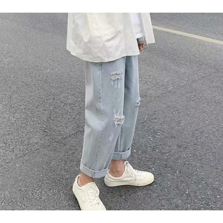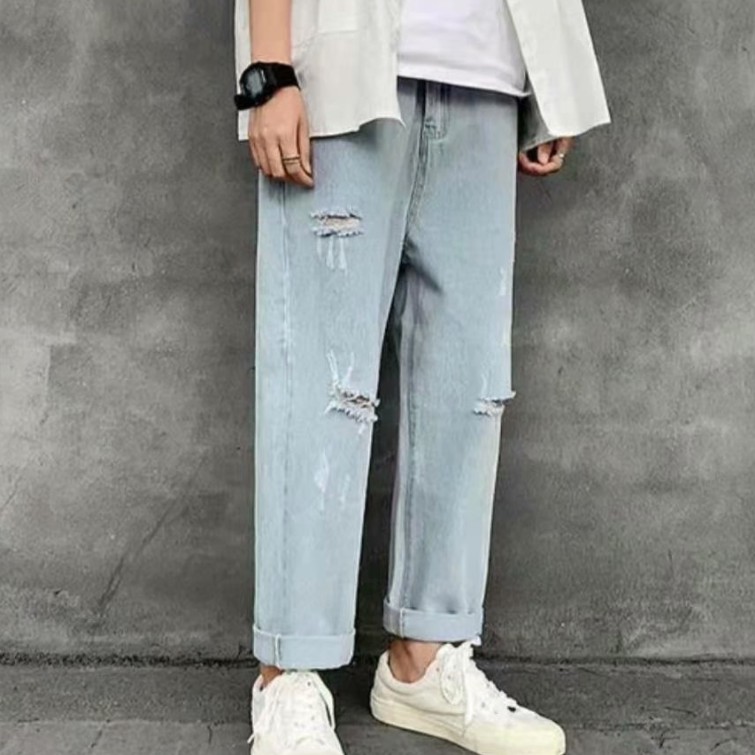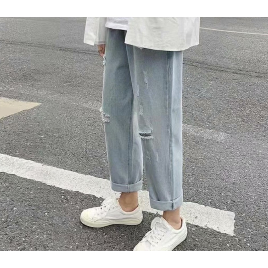 刷破牛仔褲縮口褲 牛仔褲 牛仔縮口褲 破洞 淺色 洗水 刀割 素面 破壞 水洗牛仔(MXZA8819)【FIZZE】