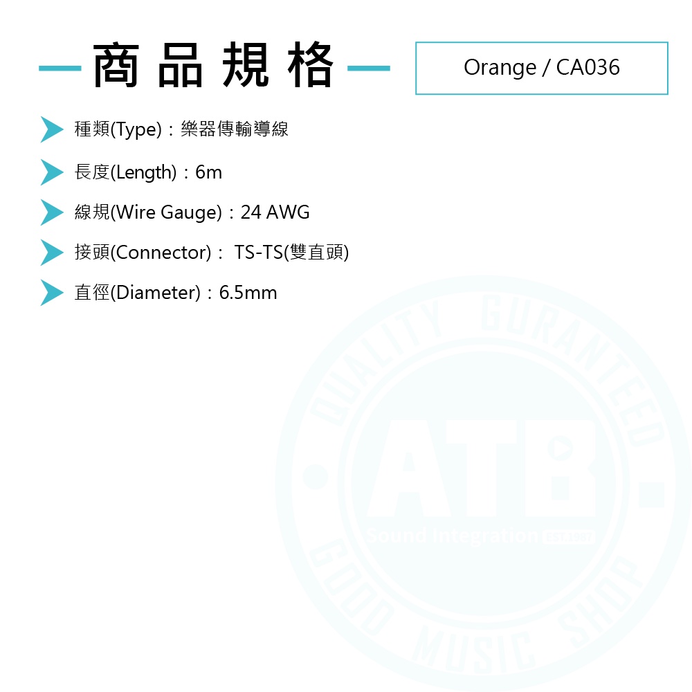 Orange / CA036 (6m) 樂器導線 TS - TS【ATB通伯樂器音響】