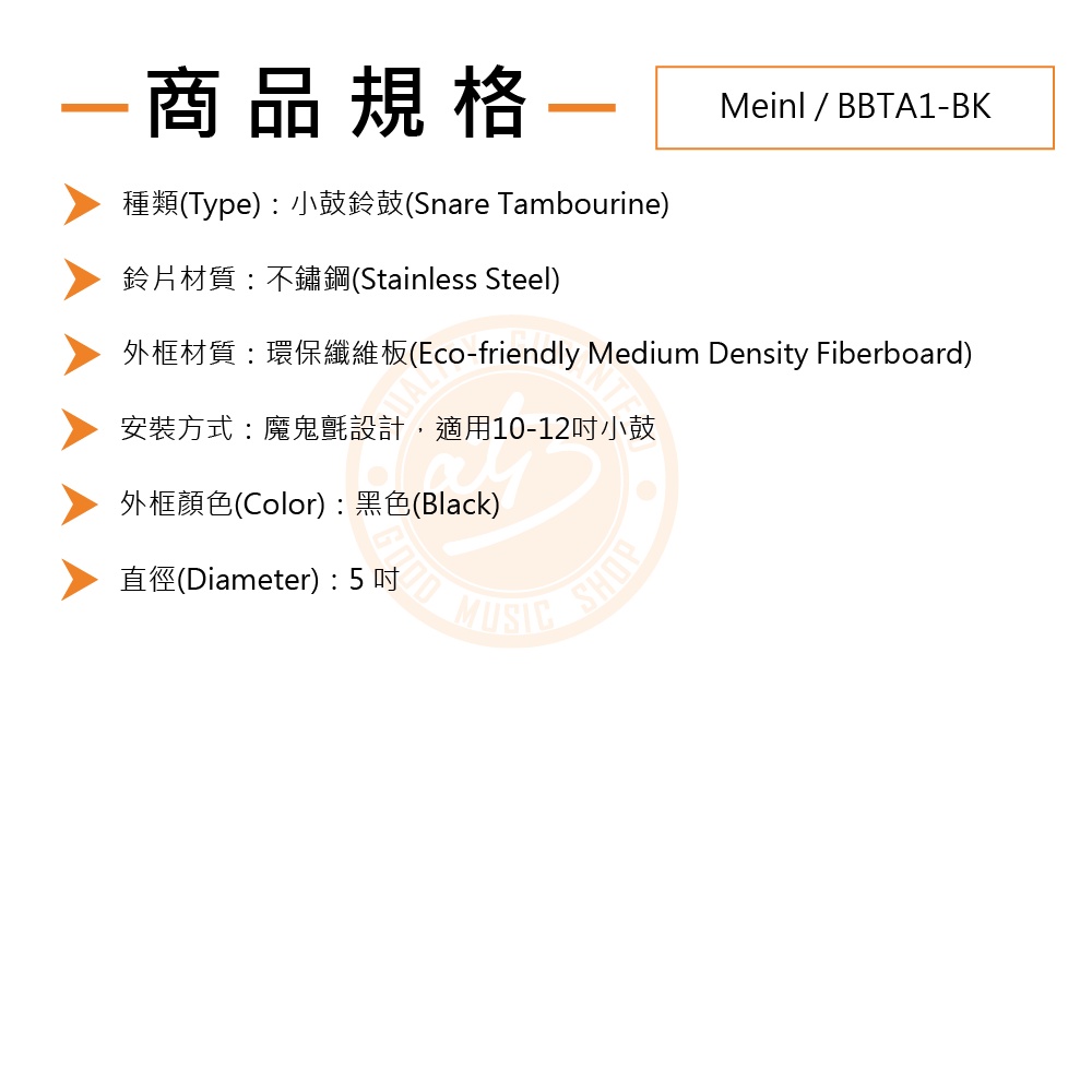 Meinl / BBTA1-BK 魔鬼氈小鼓專用鈴鼓(不鏽鋼鈴)【樂器通】