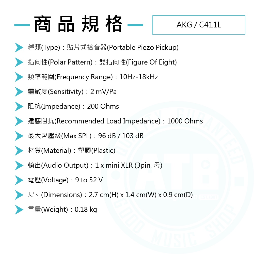 AKG / C411L 貼片式電容音頭拾音器(mini XLR接頭) 台灣代理公司貨【ATB通伯樂器音響】