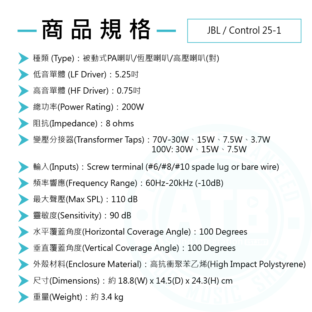 JBL/Control 25-1被動式PA喇叭(5.25吋,200W)(可切換高壓喇叭(對)台灣代理公司貨【ATB通伯】