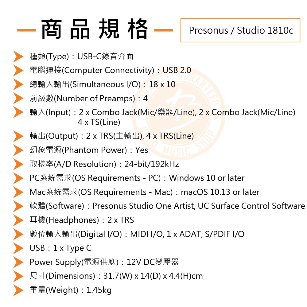 PreSonus / Studio 1810c 18in/10out USB-C錄音介面【樂器通】