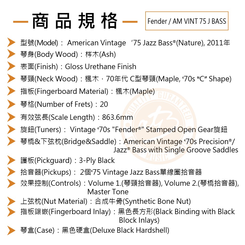 Fender / AM VINT 75 J Bass 2011年 電貝斯【樂器通】