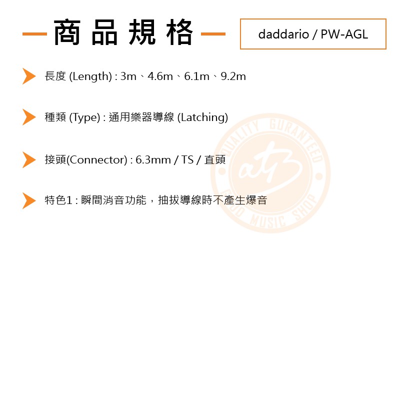 D'Addario / PW-AGL 快拆開關頭通用導線 TS直頭【樂器通】