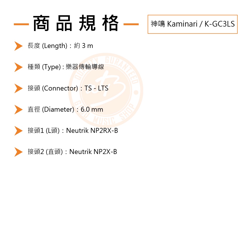 神鳴 Kaminari / K-GC3LS (3m) 電吉他導線 TS - LTS【樂器通】