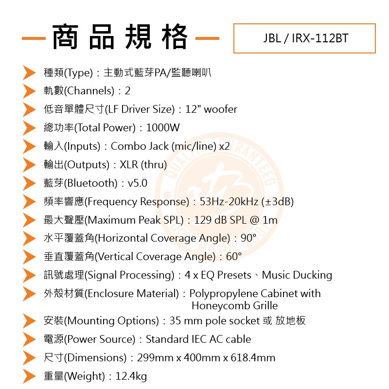 JBL / IRX112BT 12吋 主動式藍芽PA/監聽喇叭(300W,12吋)台灣代理公司貨【ATB通伯樂器音響】
