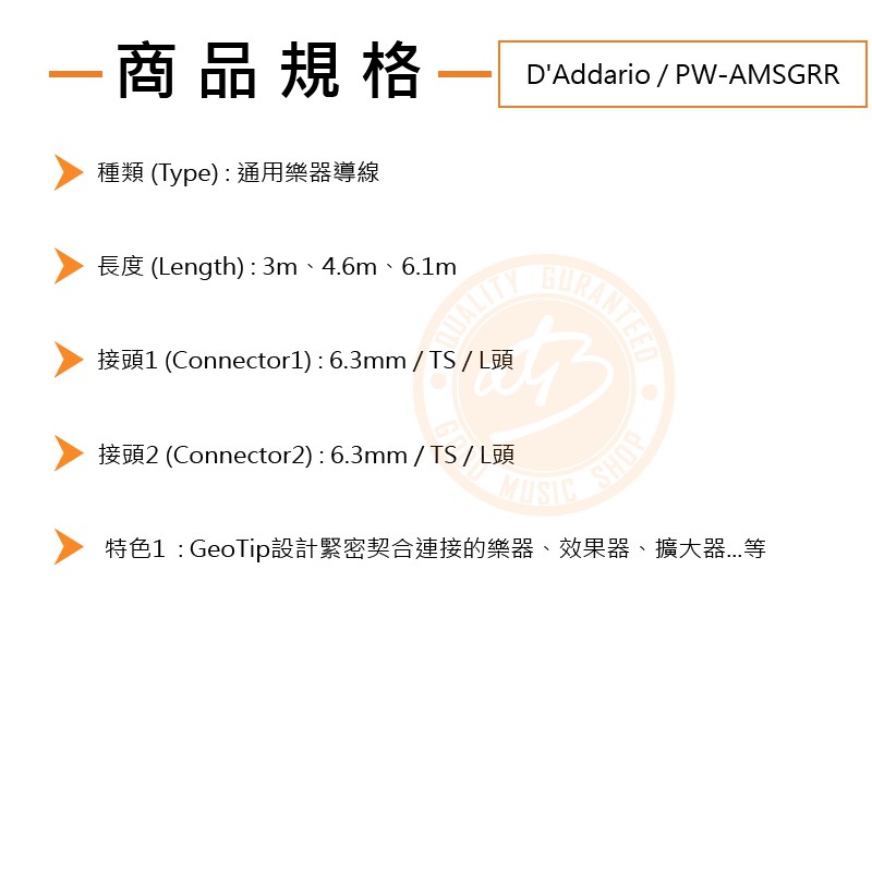D'Addario / PW-AMSGRR 通用樂器導線 TS L頭【樂器通】