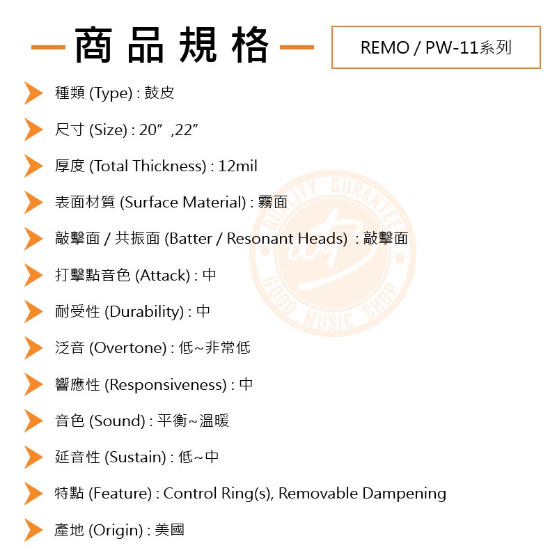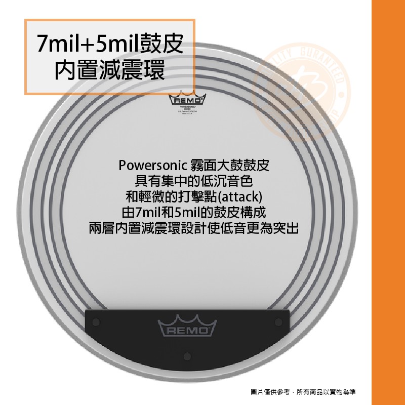 REMO / Powersonic 雙層7-mil + 5-mil +減震環 霧面大鼓鼓皮 (PW-11)【樂器通】