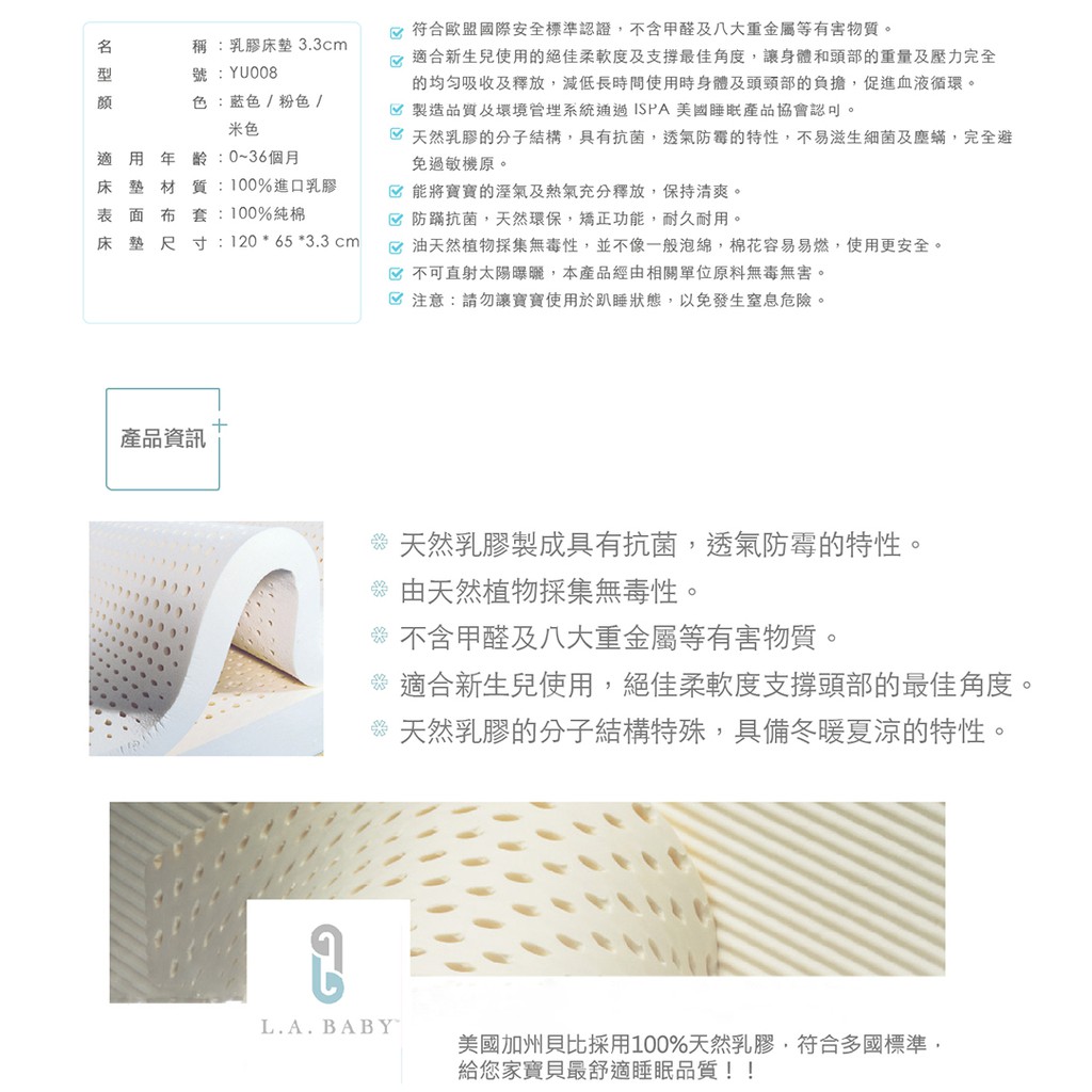 L.A. Baby 天然乳膠床墊大床-3色(厚度3.3)