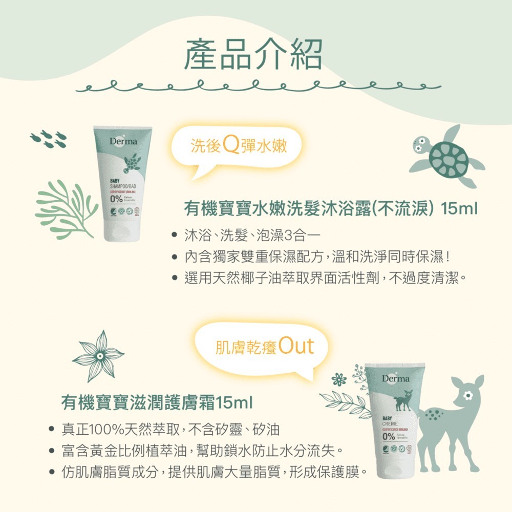 丹麥 Derma 寶寶系列 - 有機寶寶洗護隨身套組15ml (沐浴露+護膚霜)