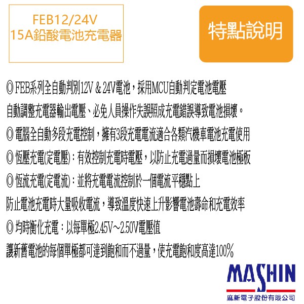 麻新電子 FEB 12/24 15 15a 全自動 12v 24v 電池充電器 可充 210AH FEB2415電瓶