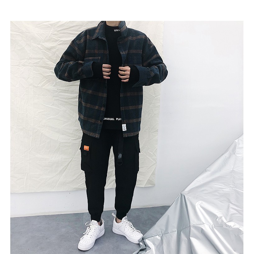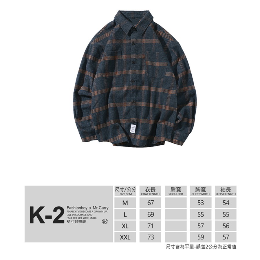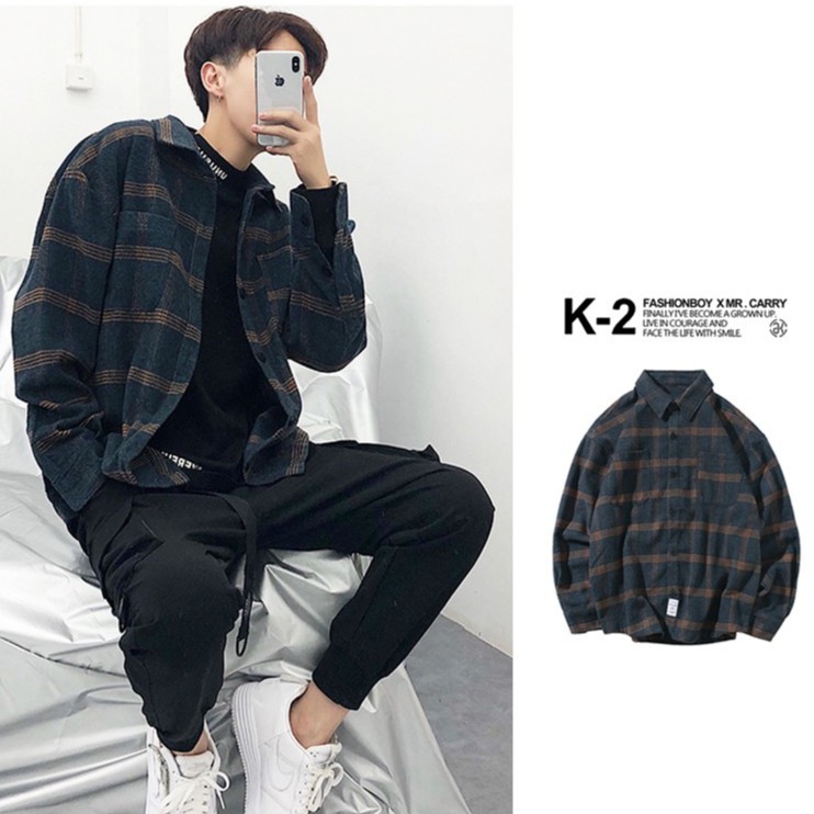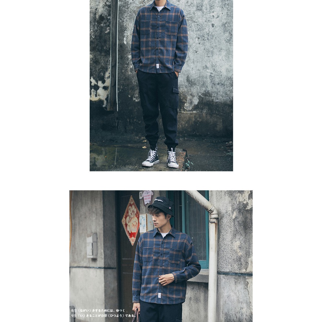 日系復古 文藝格紋 磨毛 大格子 翻领 秋裝 保暖 襯衫 長袖襯衫 街頭潮流 文清港風【B336】