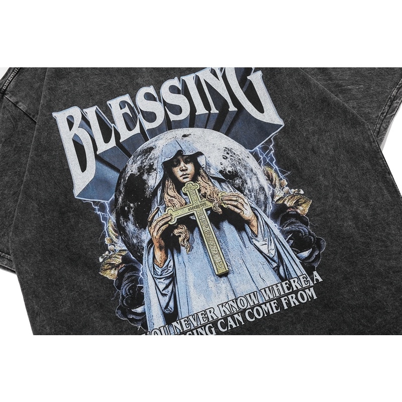 【K-2】BLESSING 祈禱 十字架 女孩禱告 地球 迷幻感 水洗短袖 五分袖 水洗短T 個性穿搭【B5014】