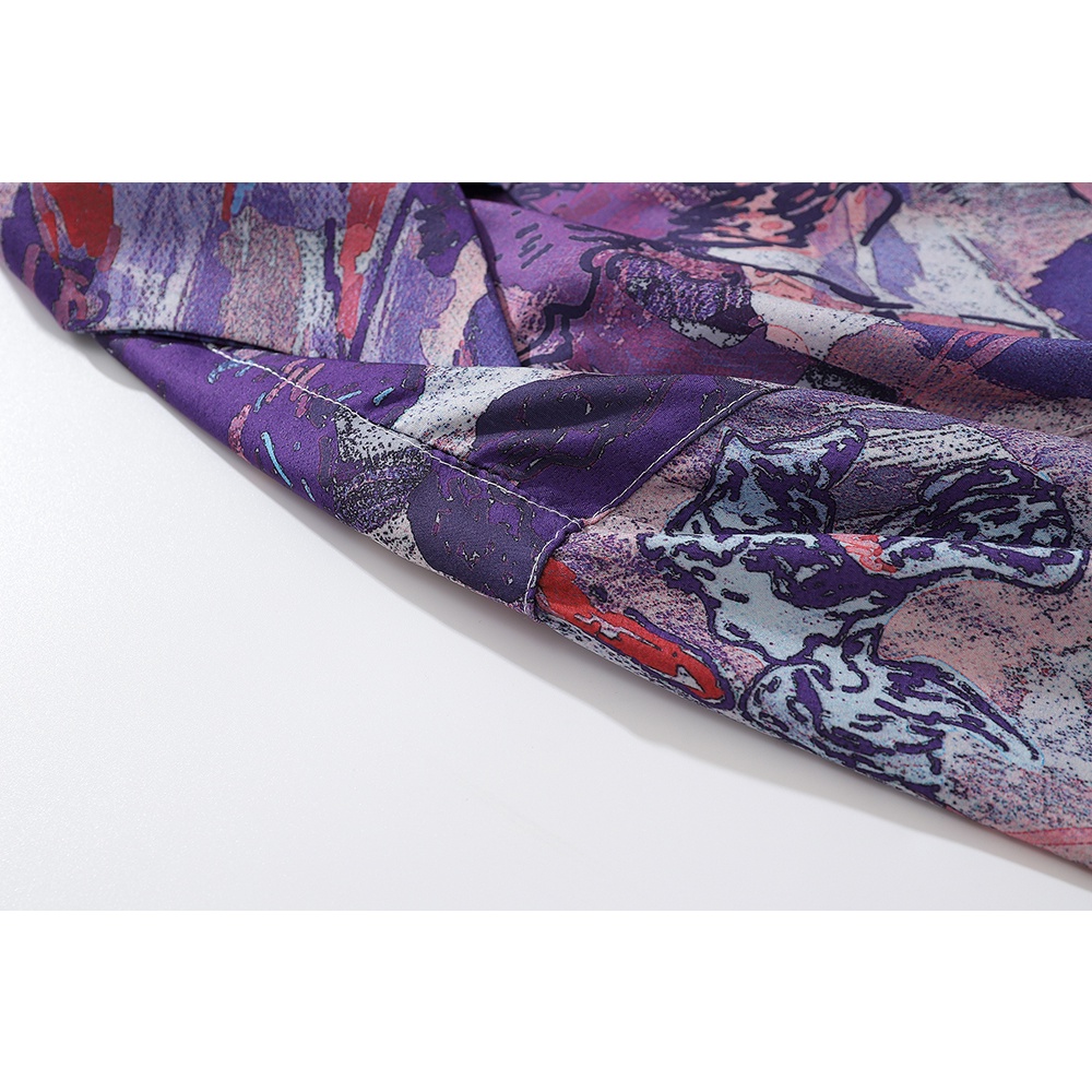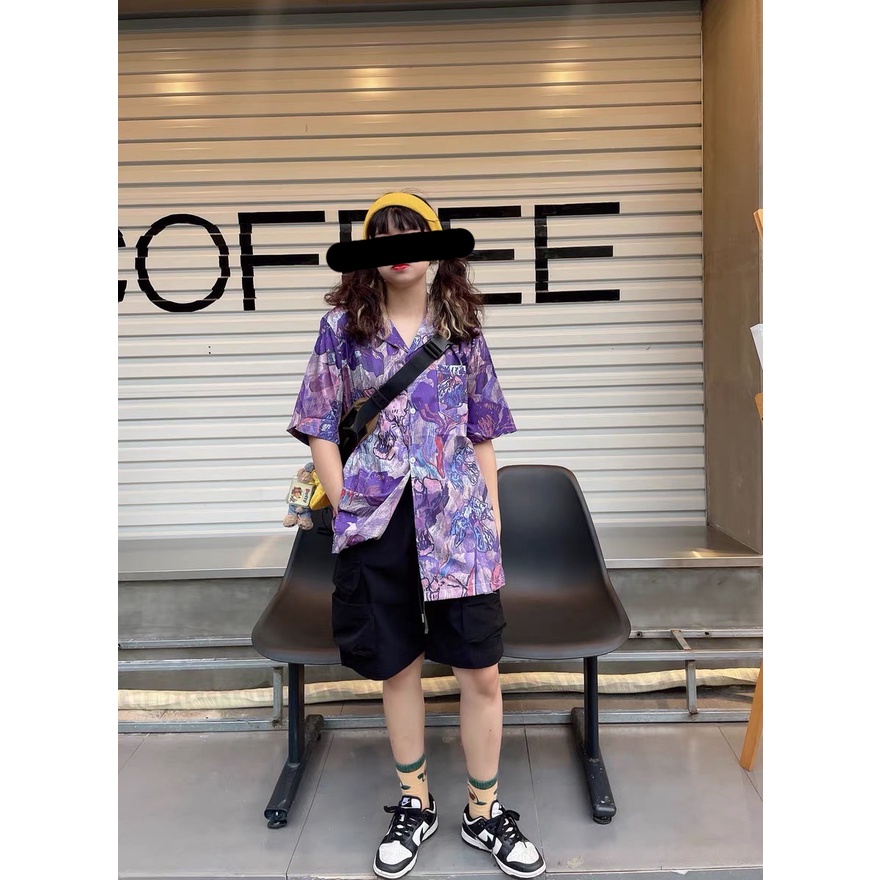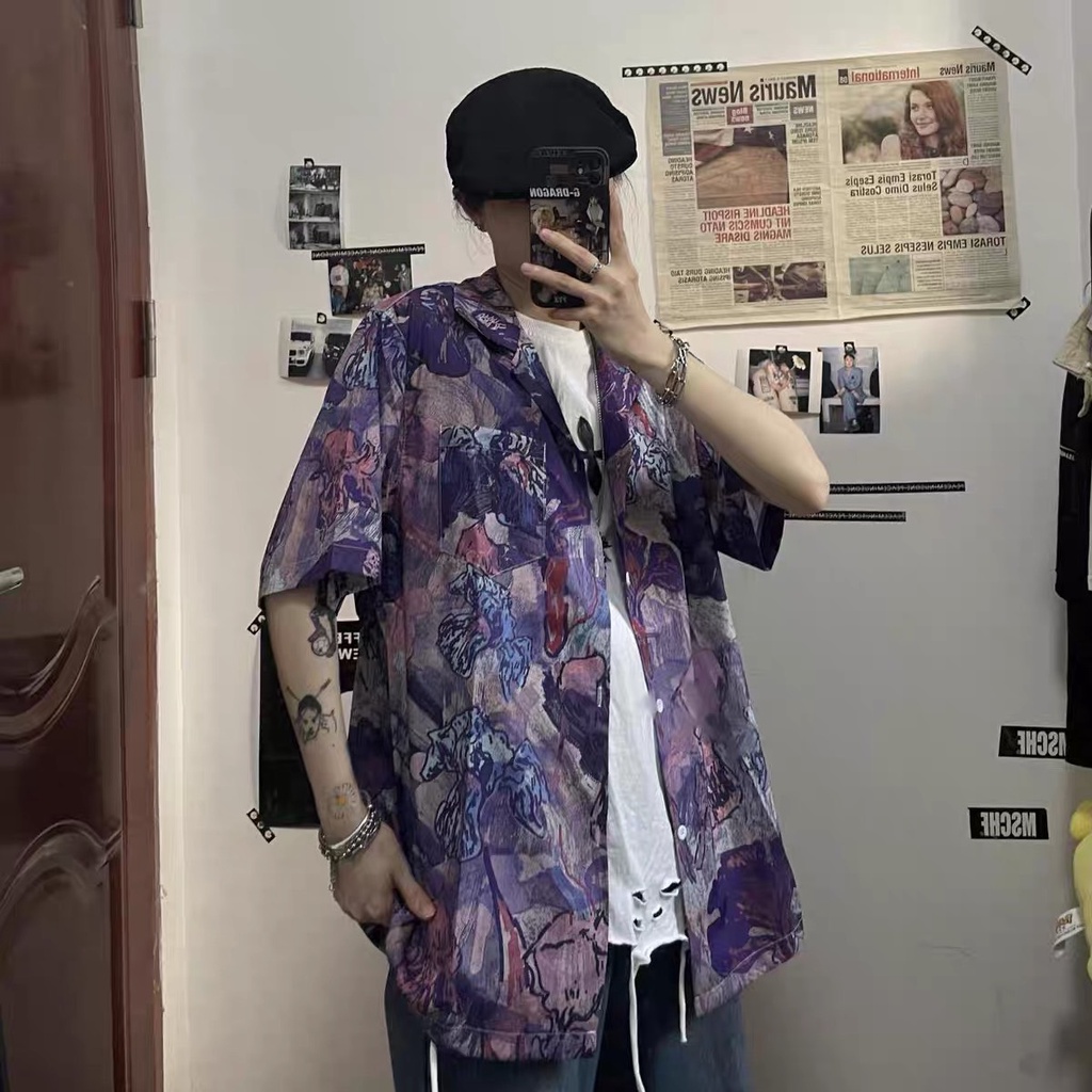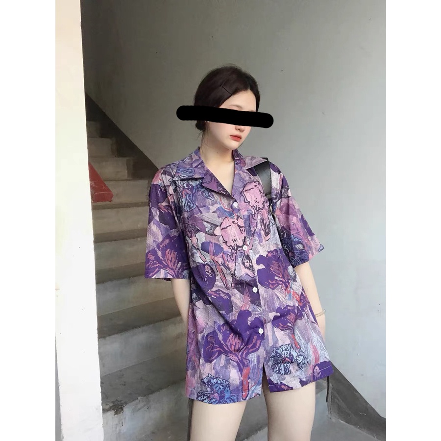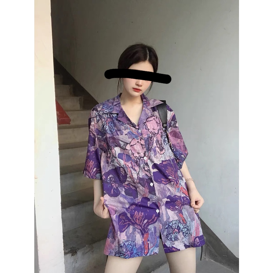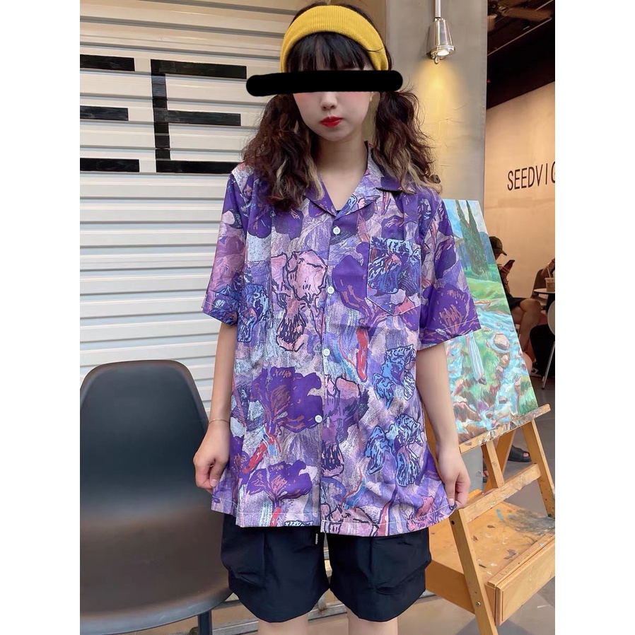 【K-2】紫色 花瓣 水彩 渲染 短袖襯衫 口袋 設計 水墨畫 彩繪 花朵 短袖 襯衫 男女不拘 個性穿搭【B2406】