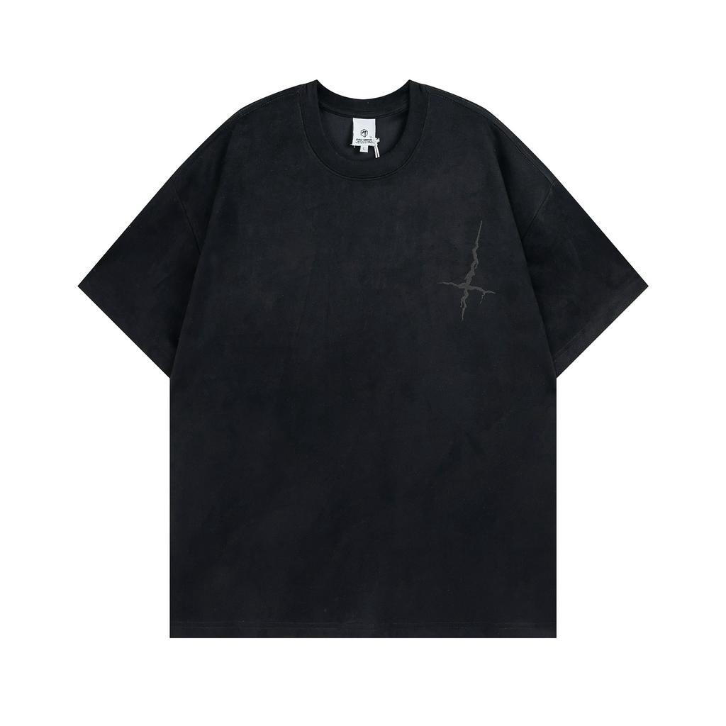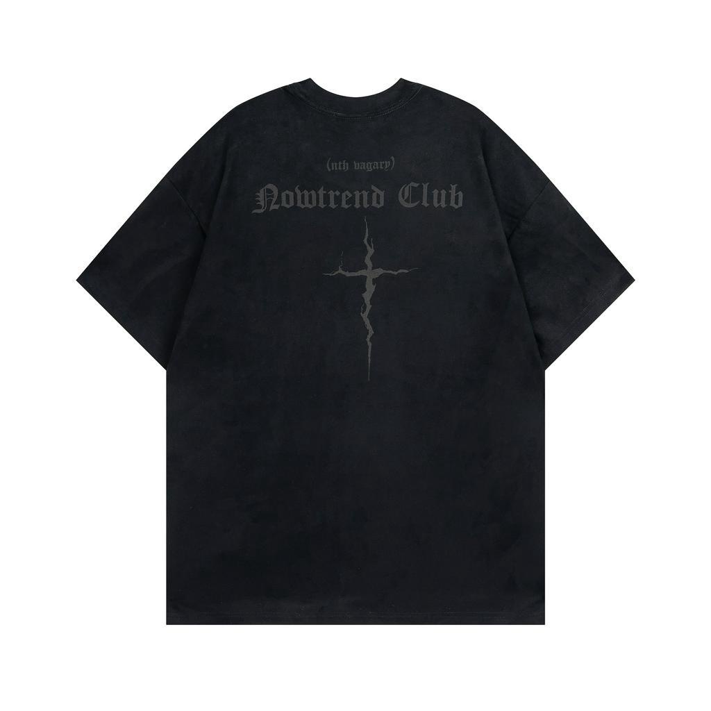 【K-2】破裂 十字架 歌德字 英文 麂皮 短袖上衣 質感 麂皮絨 五分袖 男女不拘 落肩 穿搭【A3959】