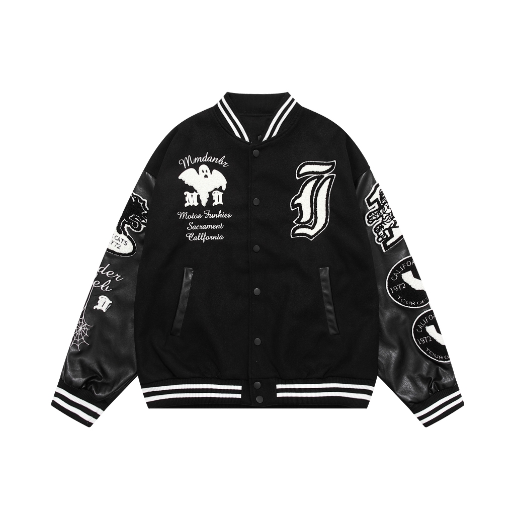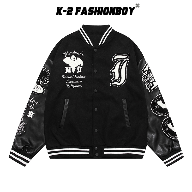 【K-2】小幽靈 棒球外套 重磅 美式 皮革接袖 刺繡貼布 街頭 穿搭 外套 情侶 夾克 帥的 幽靈外套【JLS115】
