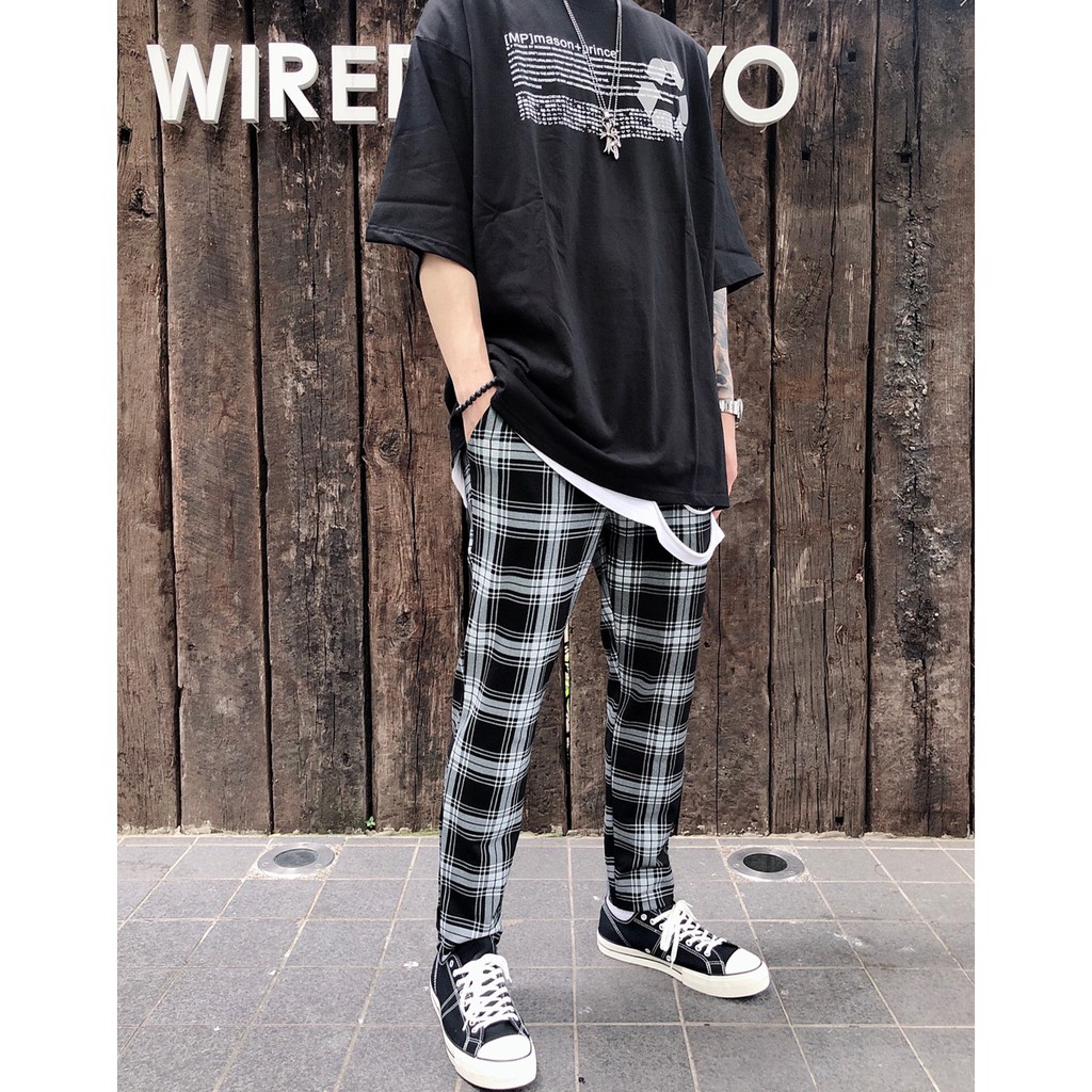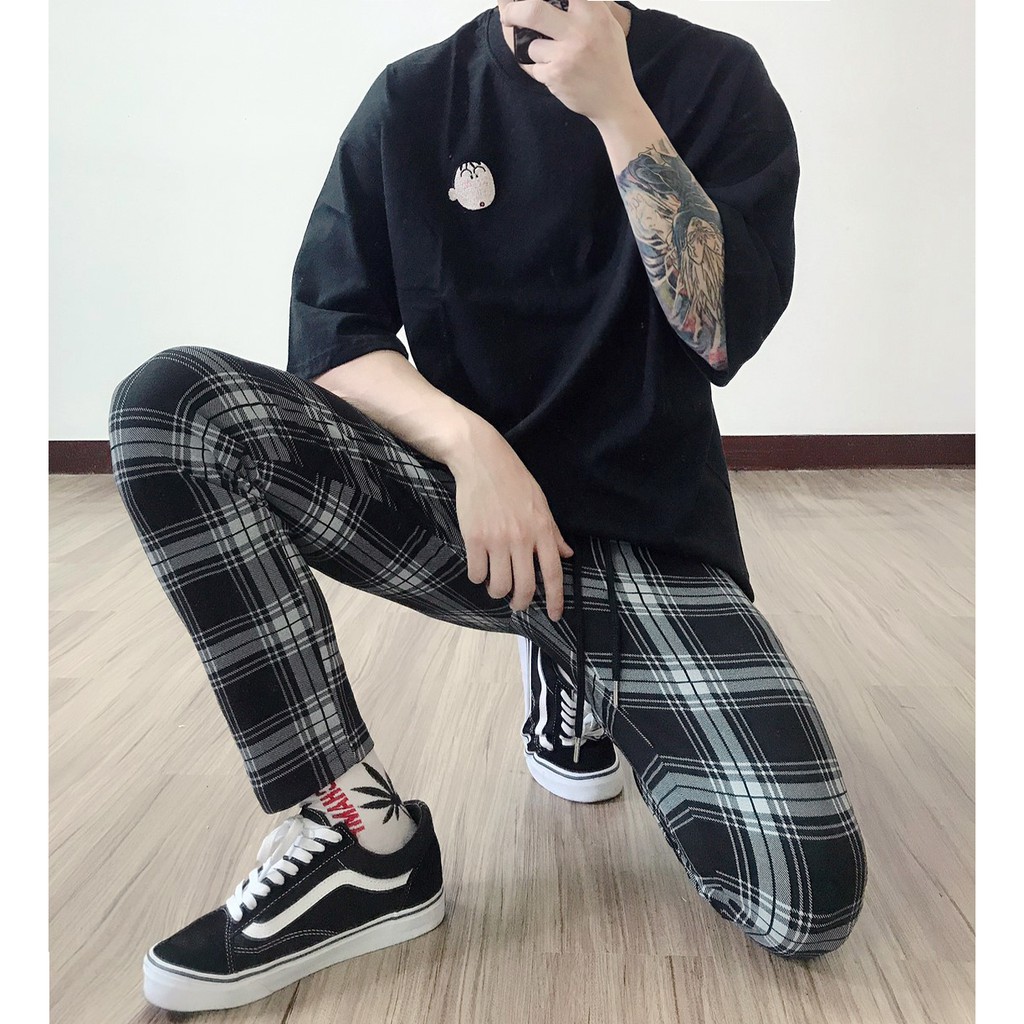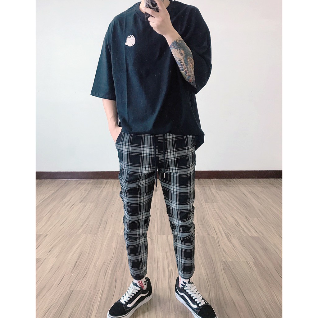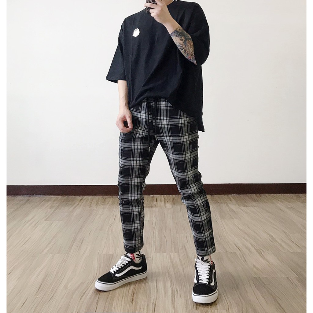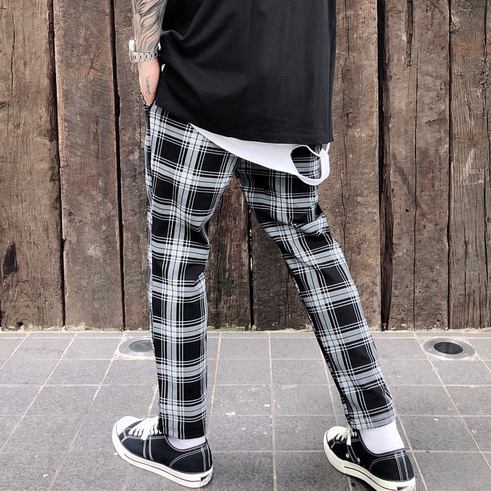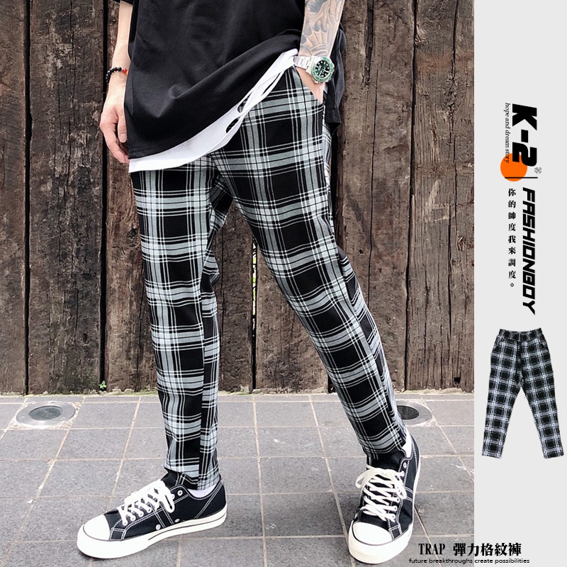 【K-2】韓國 TRAPBAE 彈性 格紋 九分褲 格子褲 微寬褲 鬆緊抽繩 休閒長褲 男女不拘 彈力褲【K25】