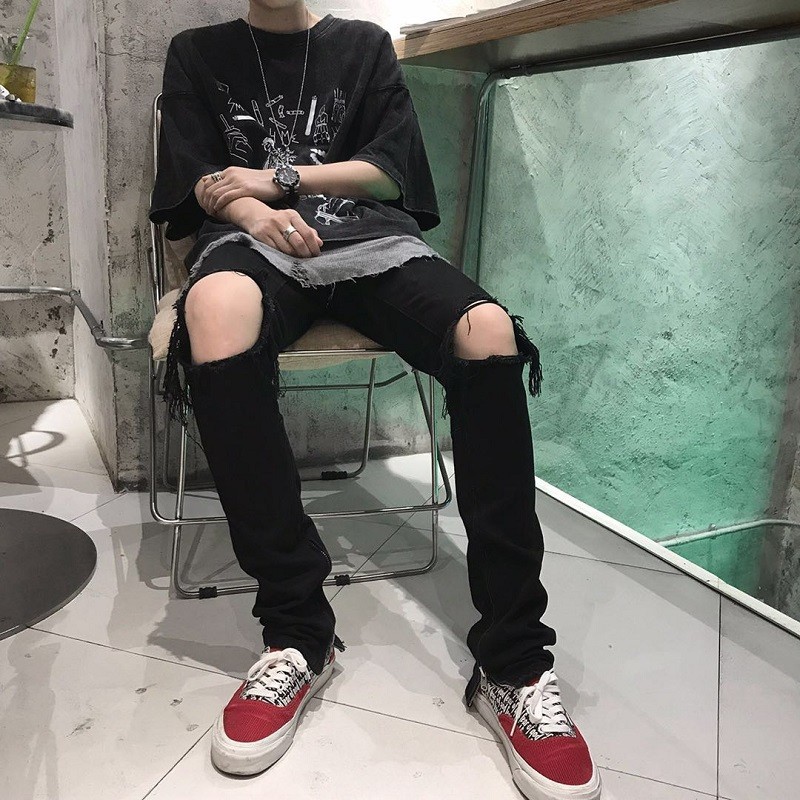【K-2】褲腳拉鍊 膝蓋大破洞 破褲 破洞 歐美 黑破褲 休閒長褲 牛仔褲 大破壞 街頭 滑板窄管 FOG【K1168】