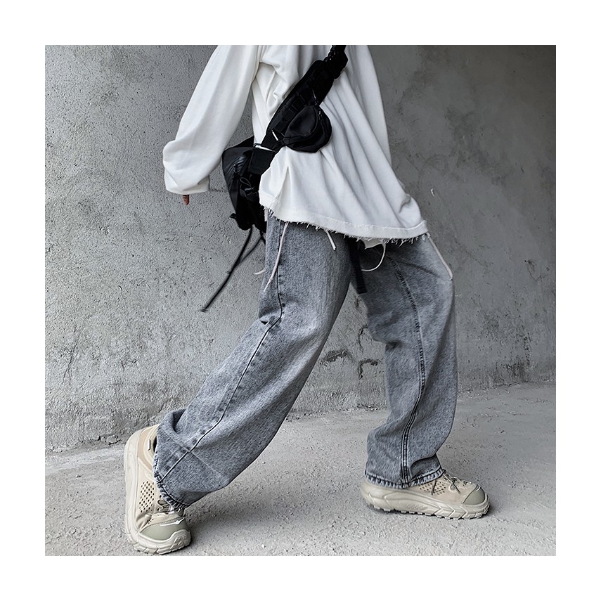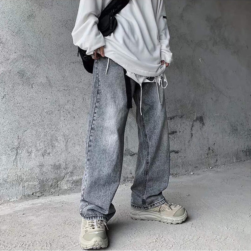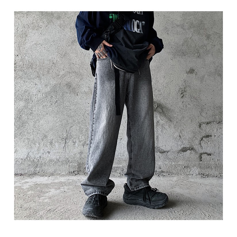 【K-2】重磅 TRAP 暗黑 丹寧 穿搭 素面 牛仔 黑灰色 寬鬆 刷色 街頭 潮流 牛仔寬褲 男女不拘【B5508】