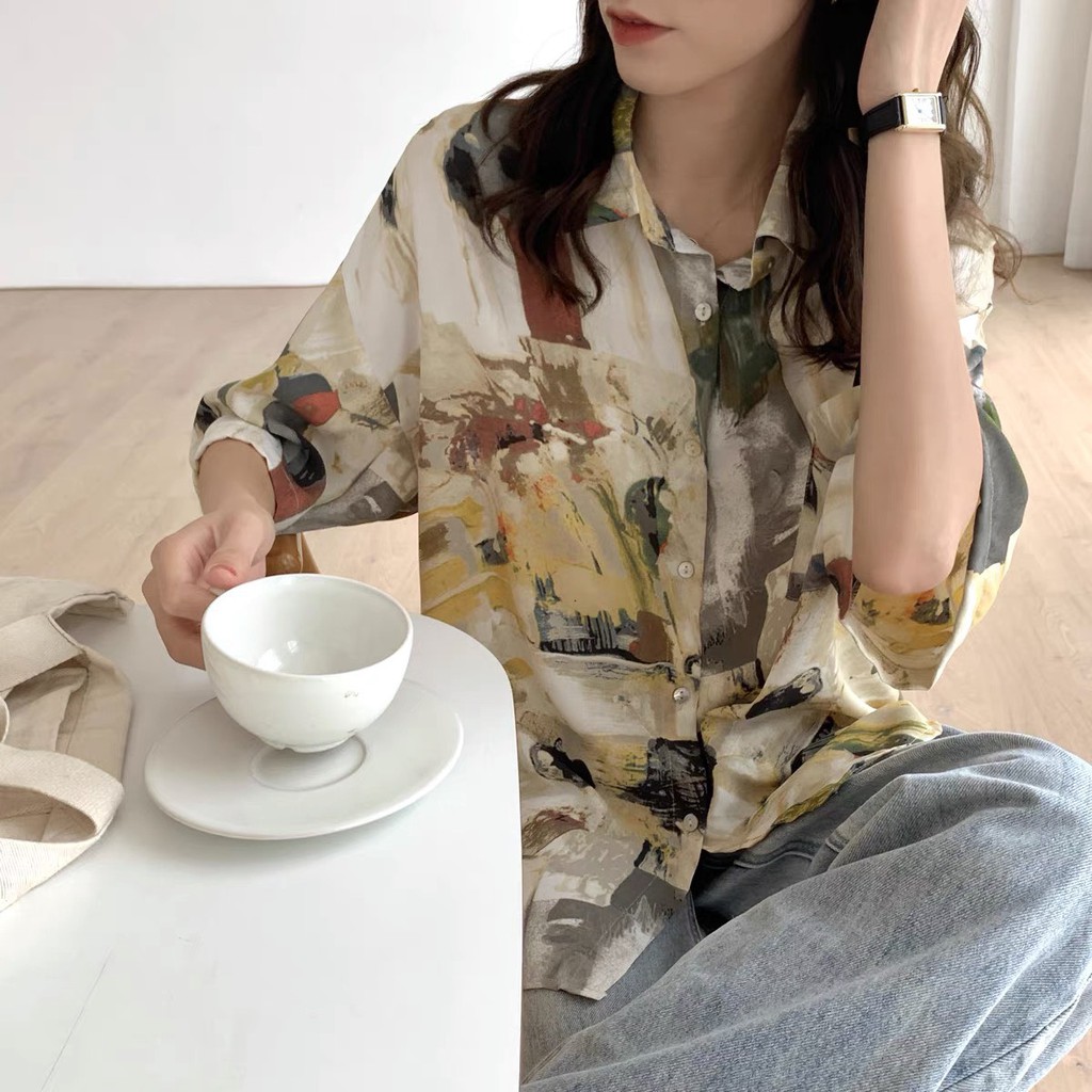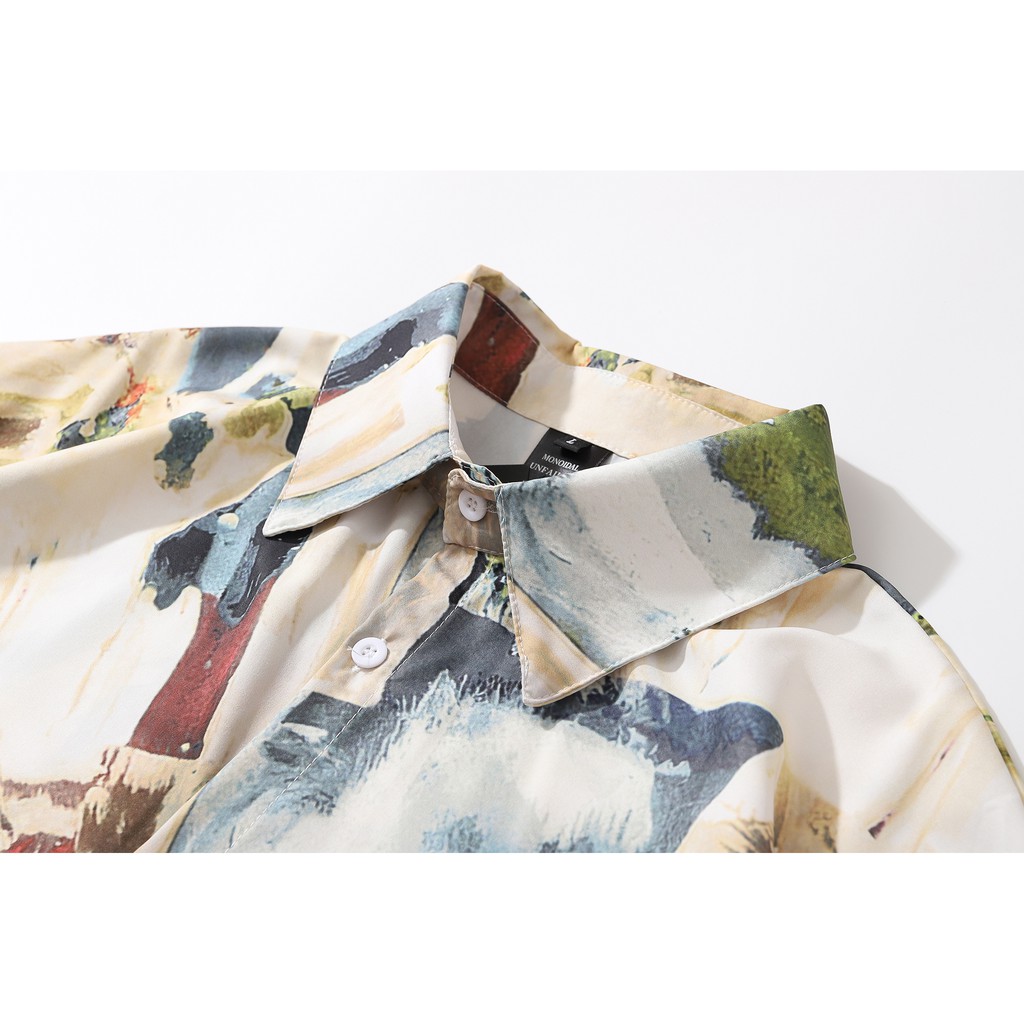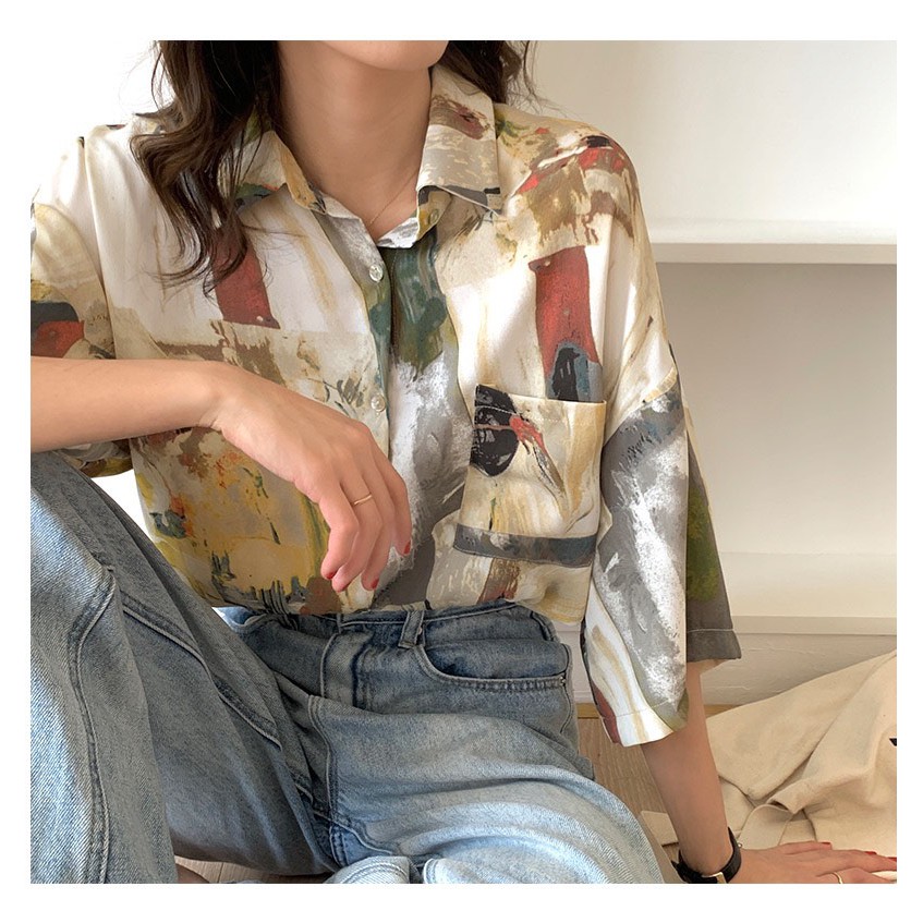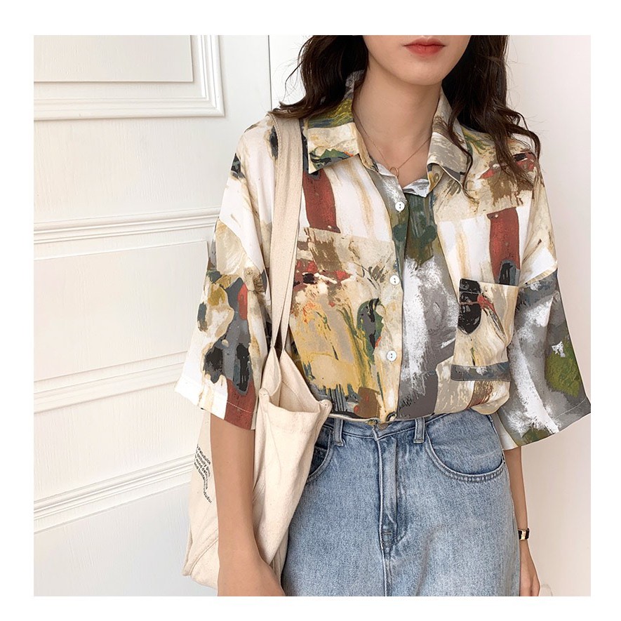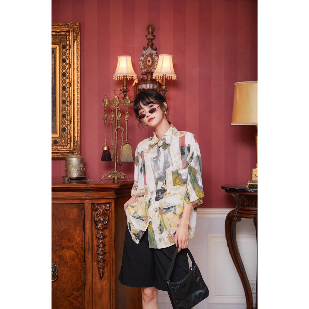 【K-2】港風 油畫 抽象 彩繪 設計感 街頭 嘻哈 潮流 寬鬆 五分袖 春夏 短袖襯衫 襯衫【BB3076】