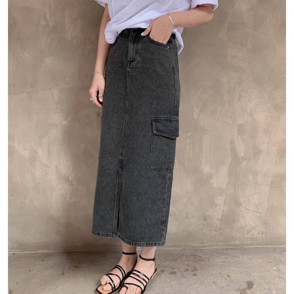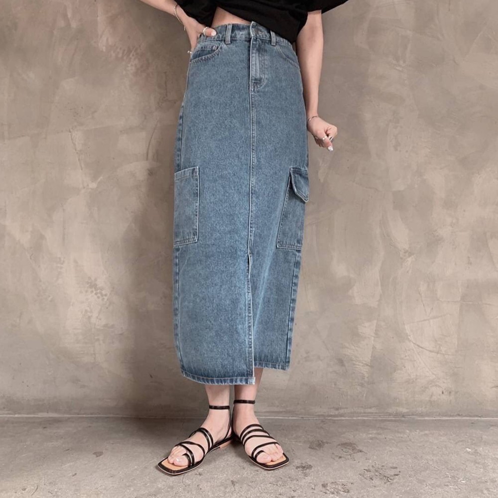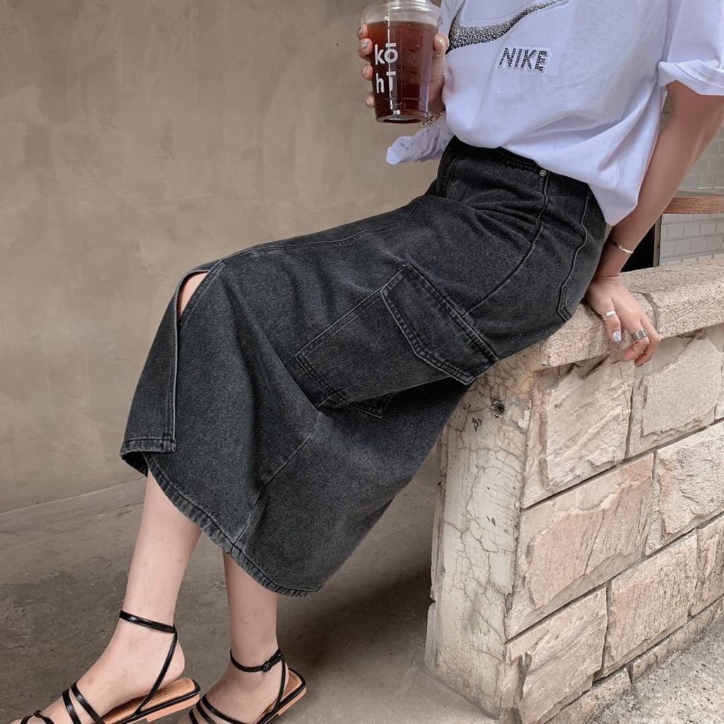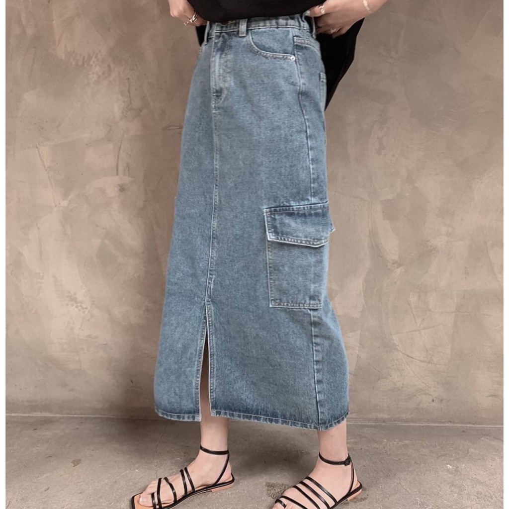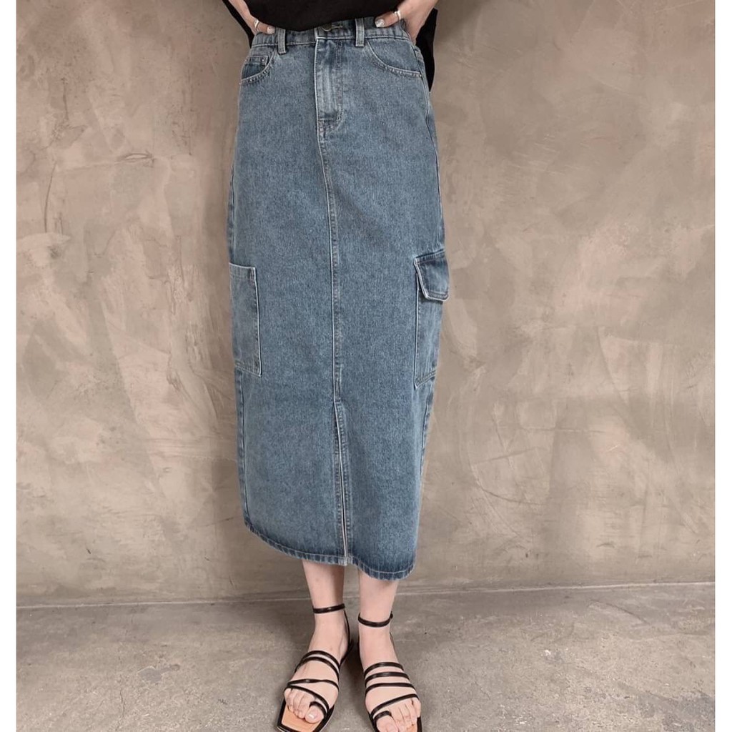 【年終感恩回饋】正韓 現貨 復古水洗刷色牛仔長裙 牛仔裙 半身裙 五分裙 中長裙 下擺開岔 女 KASO