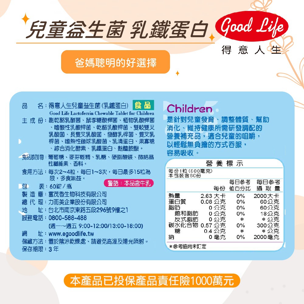 【得意人生】兒童益生菌(乳鐵蛋白)(60錠/罐) 乳酸菌/果寡糖/乳鐵蛋白/兒童咀嚼錠