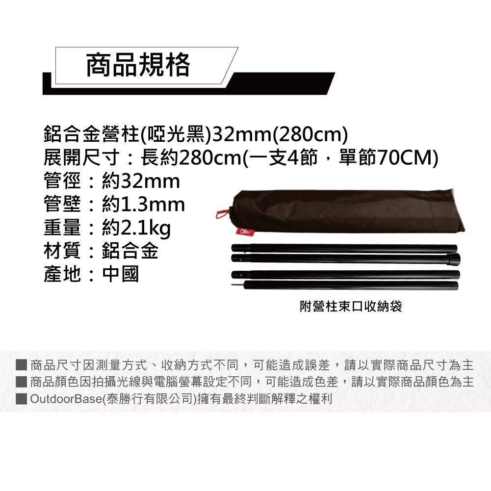 【Outdoorbase】280cm 鋁合金營柱(啞光黑)-OB22161 前庭桿 門庭桿 鋁合金營柱 露營必備 天幕杆