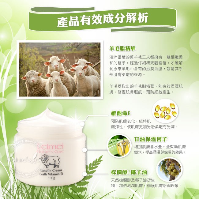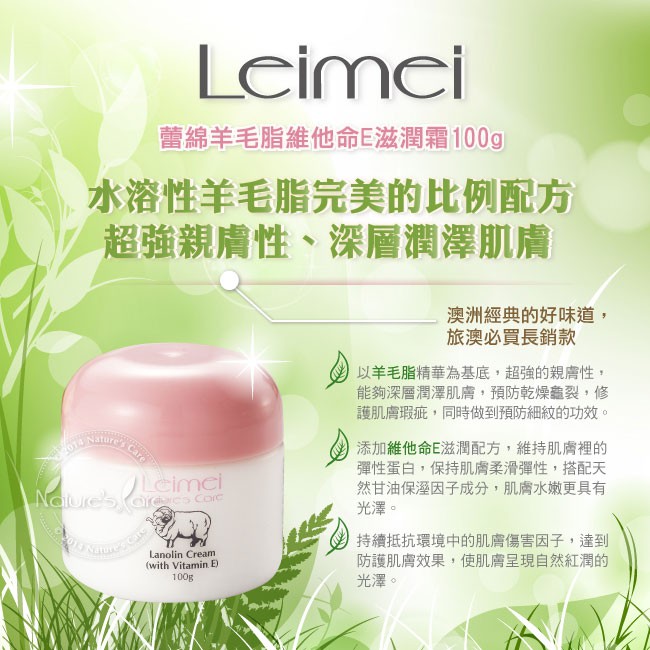 澳洲進口【Nature's Care】Leimei 澳洲羊毛脂維他命E滋潤霜綿羊油(100g/罐)