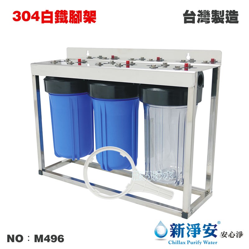 【龍門淨水】10英吋大胖三管過濾器-1透2藍-白鐵腳架式 1英吋/1英吋半 台灣製造(M496)