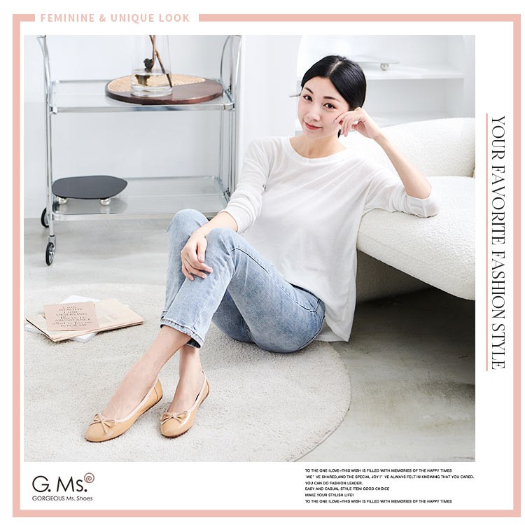 G.Ms. 全真皮蝴蝶結平底豆豆鞋-漆皮杏
