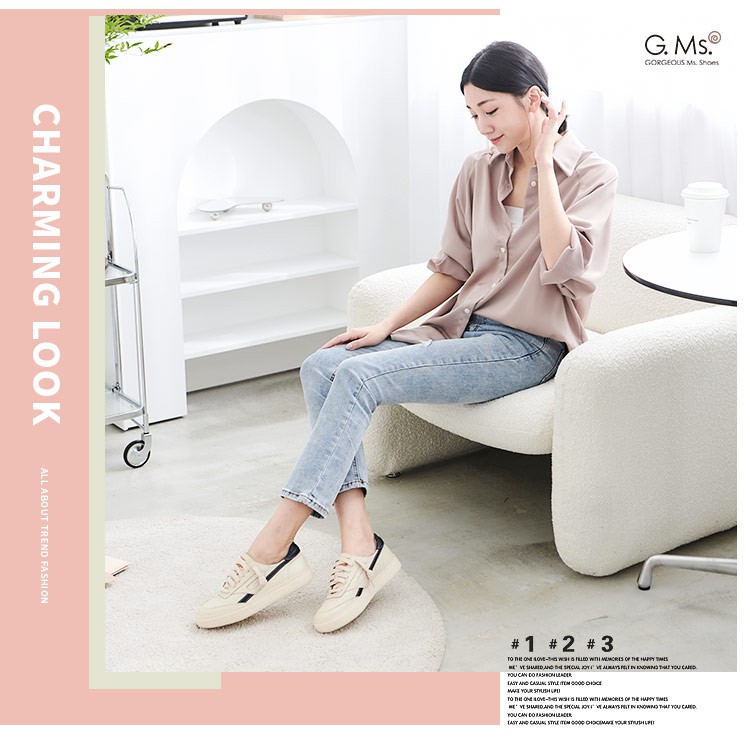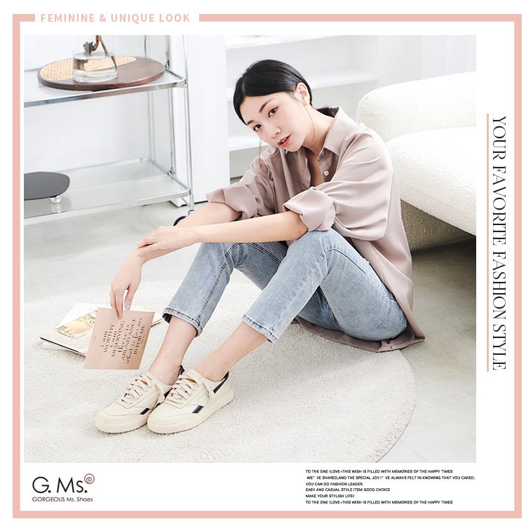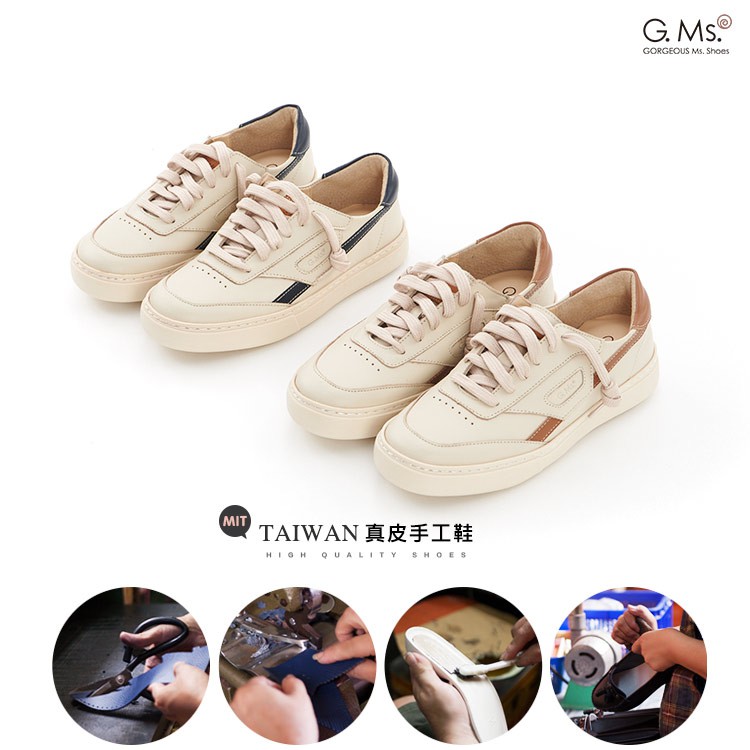 G.Ms. MIT系列-復古童趣牛皮免綁帶圓頭厚底休閒鞋-米x藍