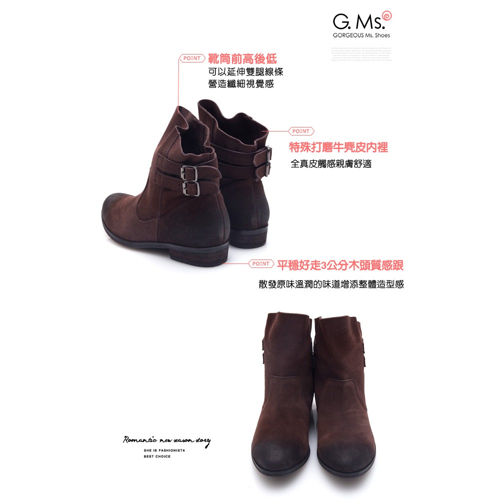 G.Ms. 牛麂皮斜口皮帶釦低跟短靴-深咖啡