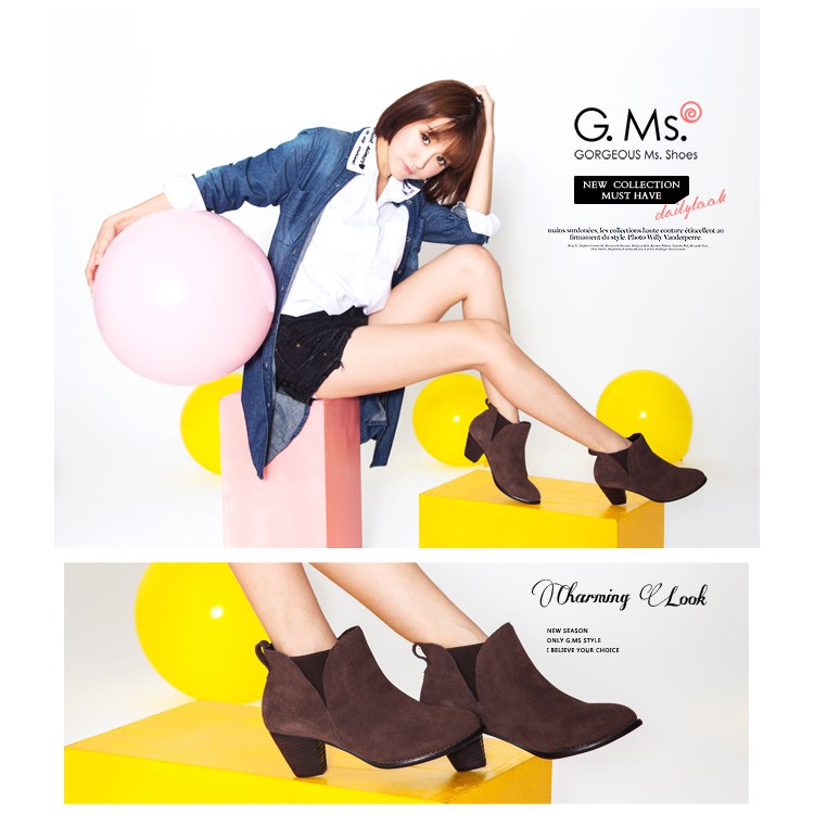 G.Ms. 牛麂皮拼接鬆緊帶造型粗跟踝靴-深咖啡