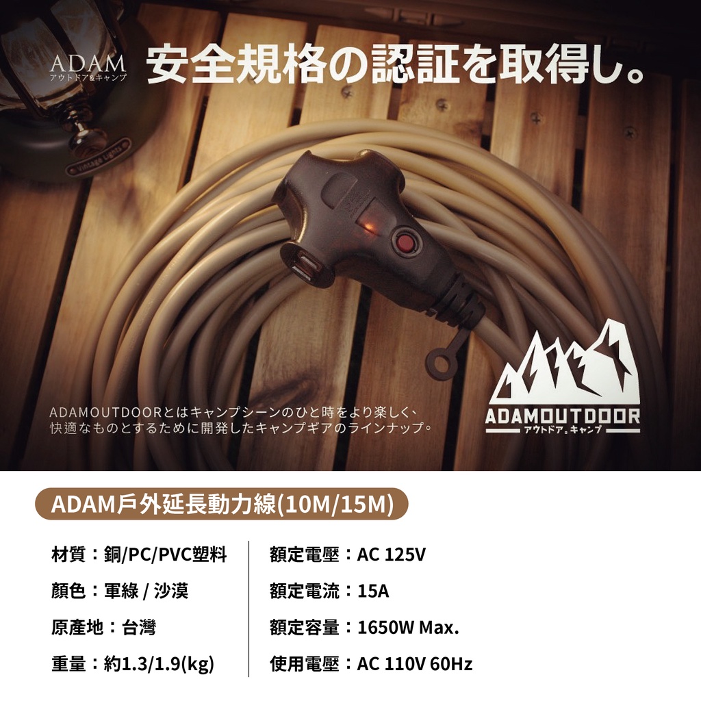 【ADAM】戶外延長動力線 10M/15M 動力線 延長線 電線 新安規 過載斷電 台灣製二孔