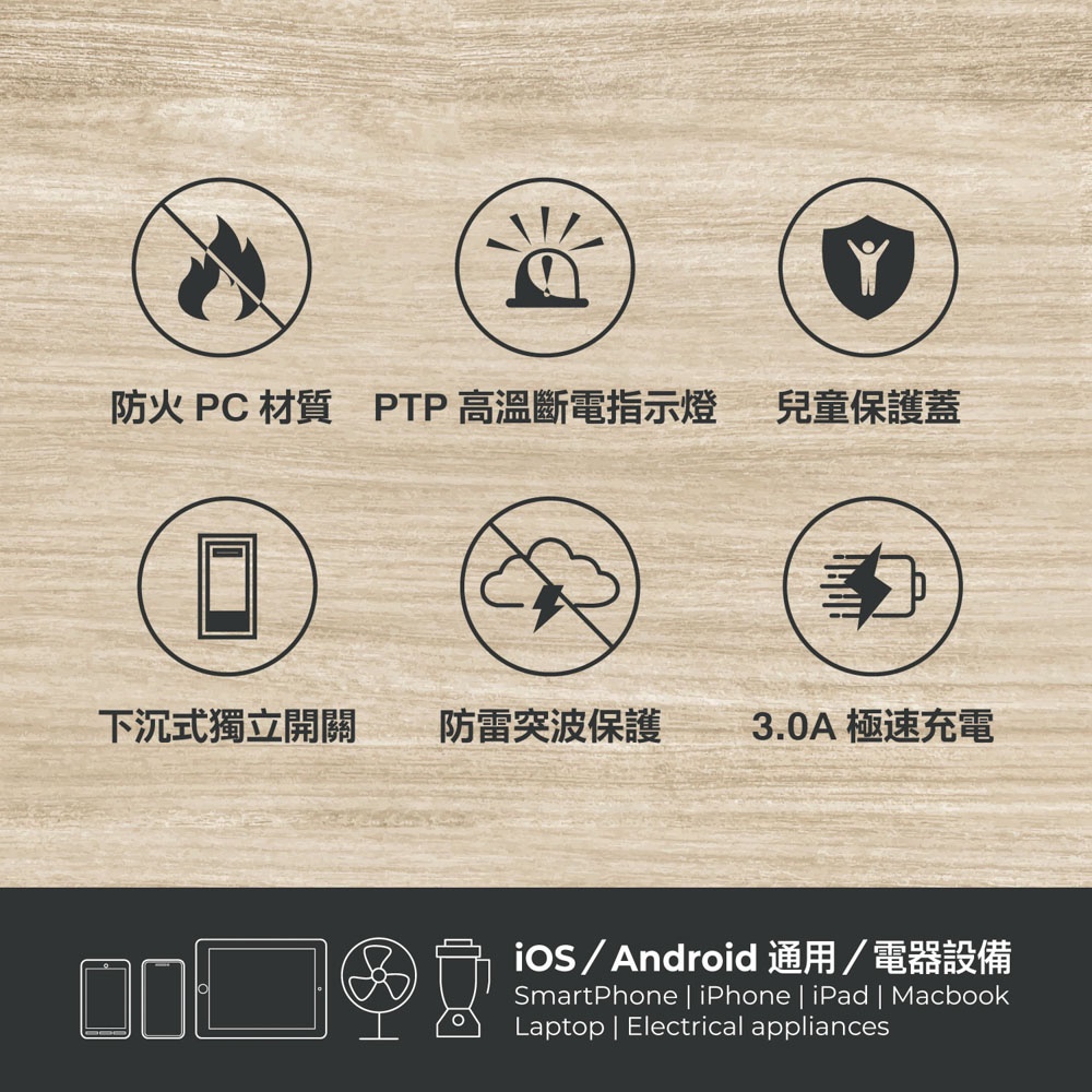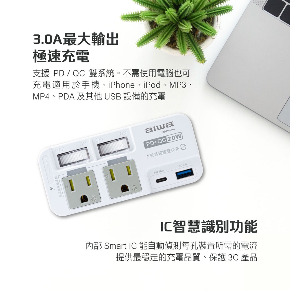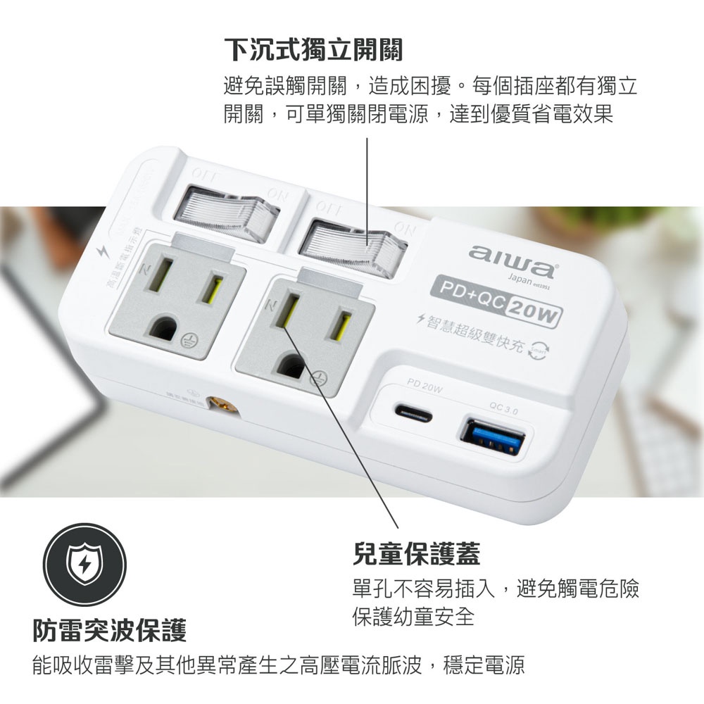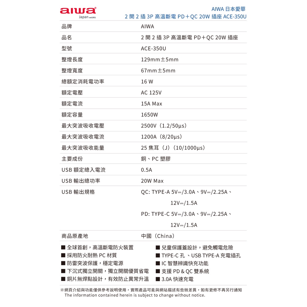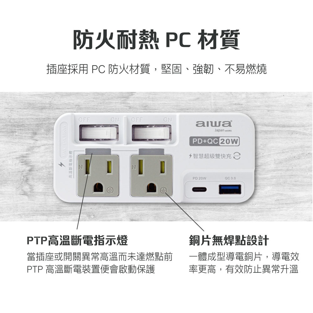 AIWA 愛華 2開2插3P高溫斷電PD+QC 20W插座 ACE-350U