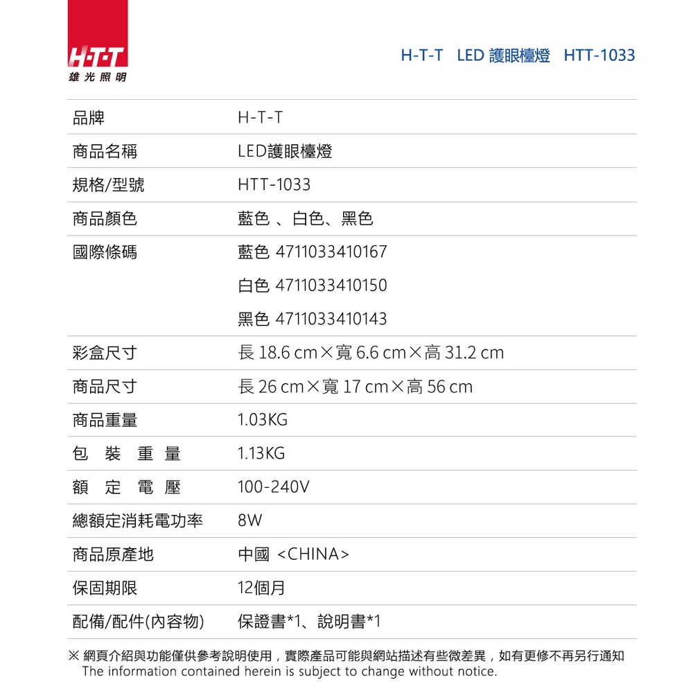 H-T-T LED護眼檯燈 HTT-1033 (黑色/藍色/白色)