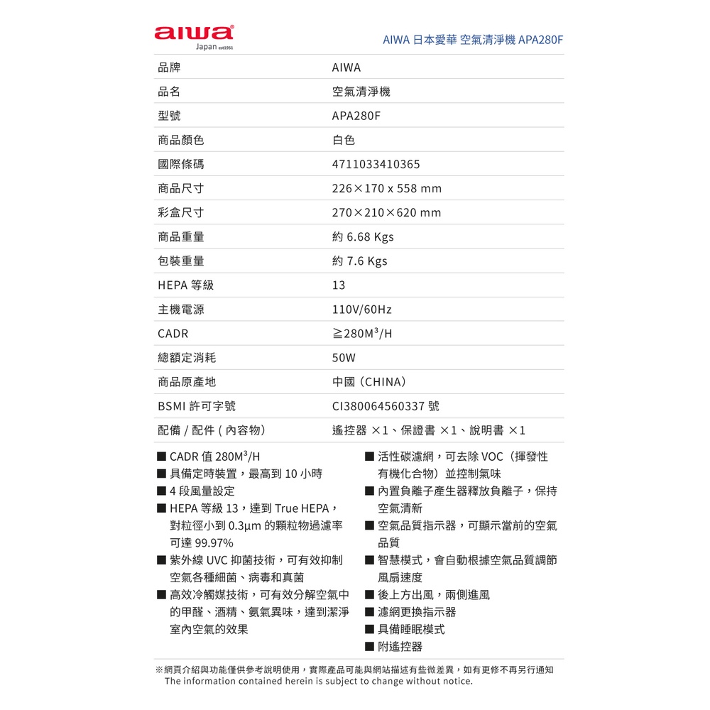 AIWA 愛華 負離子定時空氣清淨機 APA280F